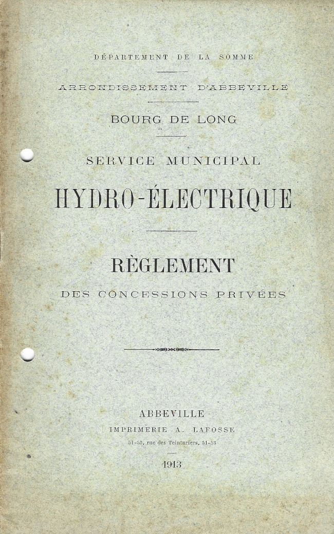 Un peu plus loin… Il serait bon que la liste des concessionnaires ne soit pas dressée d’une manière définitive et puisse recevoir les modifications reconnues nécessaires. On peu dans ce cas s’inspirer de ce qui se fait chaque année pour les ayants droit au chauffage commun (chaque année les habitants recevaient une quantité de tourbe gratuitement pour se chauffer) et établir en cession de novembre au Conseil municipal la liste des abonnés à l’eau et à la lumière. Après affichage et publication les réclamations seraient examinées et jugées par le conseil sans autre recours. Le rôle ainsi formé, dorénavant exécutoire pour l’année suivante du 1 er janvier au 31 décembre. Le rôle servirait en suite de titre au receveur municipal pour le prix des abonnements… Suit ensuite le financement des travaux avec notamment le paiement de la dépense grâce une nouvelle fois à la richesse de LONG, la tourbe. Monsieur de Rouvroy souligne dans cette lettre au Préfet que l’exploitation des tourbières est la principale industrie de la Commune et se divise en deux parties ; la première partie entièrement affectée au chauffage des habitants et la deuxième dite tourbage extraordinaire dont l’importance est fixée chaque année par le Conseil en fonctions des besoins et investissements. Dans cette même lettre on apprend que la commune n’a jamais eu recours à l’emprunt, les ressources de la Commune et une bonne gestion ont toujours équilibré le budget.
