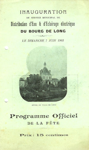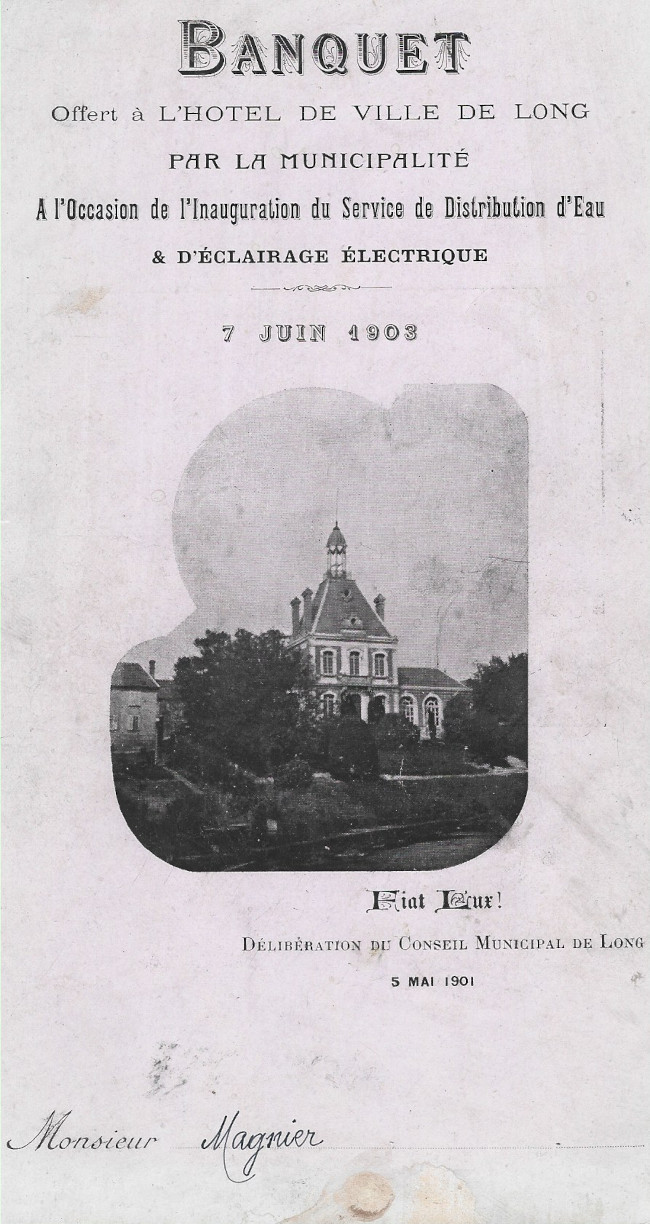 Dans sa séance du 2 août 1900 Monsieur de Rouvroy expose au Conseil municipal que depuis quelques temps plusieurs membres du Conseil municipal (visionnaires avant l’heure) demande que soit étudiée la possibilité d’offrir aux habitants l’électricité et l’eau courante dans la maison. Chateau Chinon avait déjà la sienne et elle servira de modèle au projet de LONG.