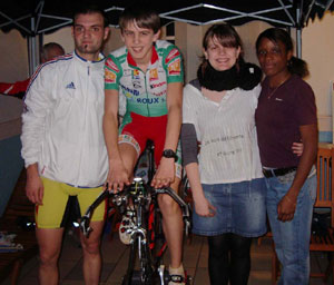 Cette année nous avions la chance d’avoir la présence de Vincent HURTELLE, 3 fois champion de France, 2 fois 3ème de la coupe du Monde, cycliste handisport qui participera l’an prochain aux jeux para olympiques. Il était accompagné par des amis sportifs de haut niveau (Nicolas GIULIA 4 fois champion de France sur piste, 2 en vitesse et 2 en poursuite, vice champion d'Europe sur piste 5ème au Monde sur piste, Thomas JANSON multiple fois champion de Normandie sur piste, Emilie LEBRUN, 20 ans, jolie comme tout pas vrai les gars, professionnelle depuis 2 ans dans l'équipe Vienne Futuroscope et Mathilde LAGUI, 4 ème au championnat d'Europe du 200 m junior, membre de l'équipe de France d'athlétisme, très jolie également mais peut-être plus très libre) qui ont aidé les cyclistes de LONG à pulvériser le record en l’amenant à 1310 km en 24 heures.