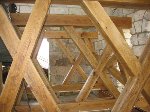 Le beffroi, ossature de bois, est conçu pour isoler les murs de pierre des cloches. Il est constitué d'un entrelacement complexe de croix en chêne et repose sur un rebord en pierre dépassant des murs intérieurs de la tour. Lorsque les cloches sonnent, le matériau plus indulgent qu'est le bois absorbe les vibrations. Si les cloches étaient reliées directement à la pierre, leurs vibrations dangereuses affaibliraient les murs qui finiraient par s'écrouler. Cette osssature de bois de chêne présente une plus grande résistance à l'action de va-et-vient de ces cloches mises en branle. Notre charpente a l'air de jouer parfaitement son rôle... Nos Anciens avaient déjà tout fait pour rendre cette charpente efficace, rigide et solide.