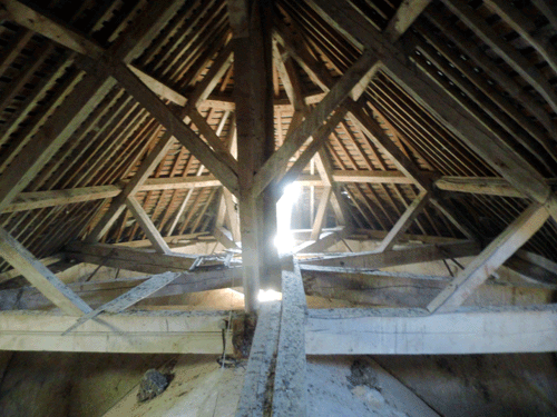 À la fin du XV e siècle, les pans de bois des beffrois furent composés d'une succession de croix de Saint-André, dont l'assemblage à mi-bois les rendait beaucoup plus rigides, et arrêtait les effets de l'oscillation sur les tenons et mortaises. C'est en effet le cas dans notre clocher et nous avons dû en renforcer un en changeant le fer du centre. Nous avons dans notre clocher également