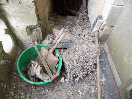 Mais avant de commencer, je voudrais rappeler un autre travail nécessaire... celui de vider le haut de la flèche. En effet les corbeaux y ont déposé des tas de petites branches et les pigeons de la fiente. Cela a été fait en 2019 mais ce très gros travail sera à refaire réglulièrement et le plus difficile est de trouver une solution pour descendre tout cela et l'emmener... j'ai déjà vu des artisans couvreurs se servir d'un système fait de tuyaux d'environ 50 cm de diamètre qui sont emboités les uns dans les autres... cela pourrait être le moyen idéal de nous aider dans ce travail. Peut-être faut-il investir !