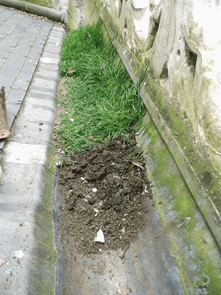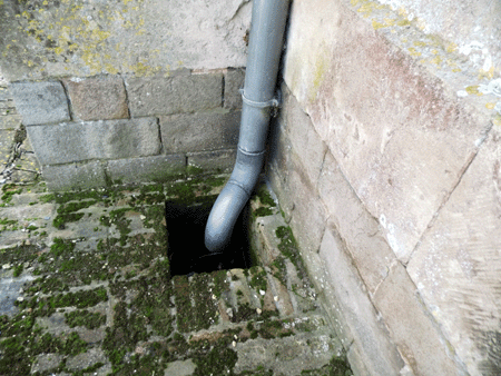 Réparer le muret côté Nord et installer un tuyau d'évacuation de l'eau du regard côté clocher.