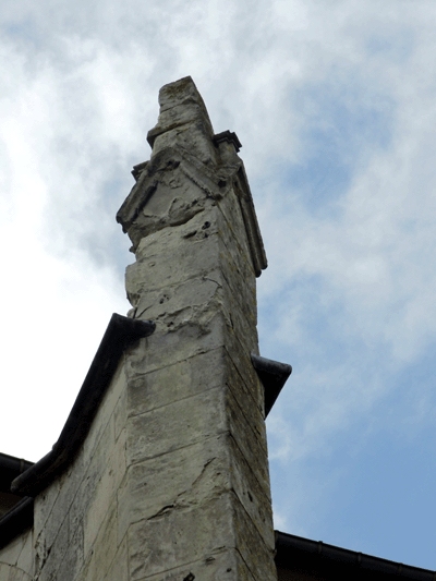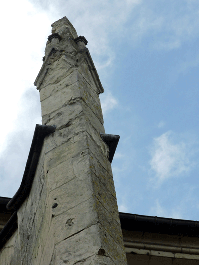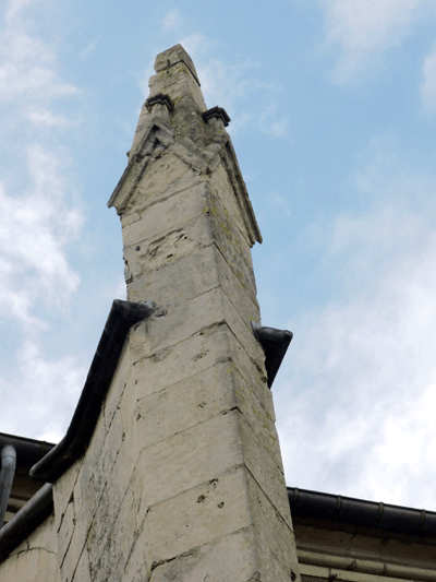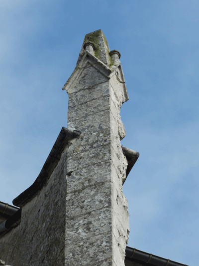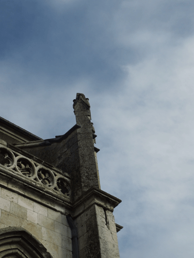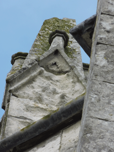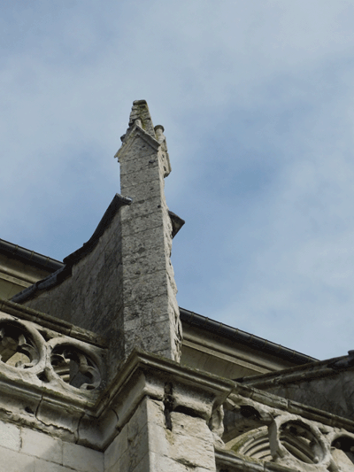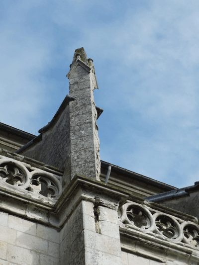 Le décor sculpté de la tête des quatre contreforts est encore lisible mais altéré.