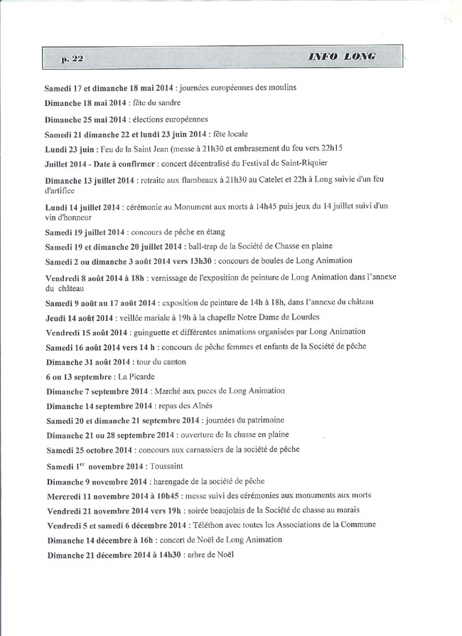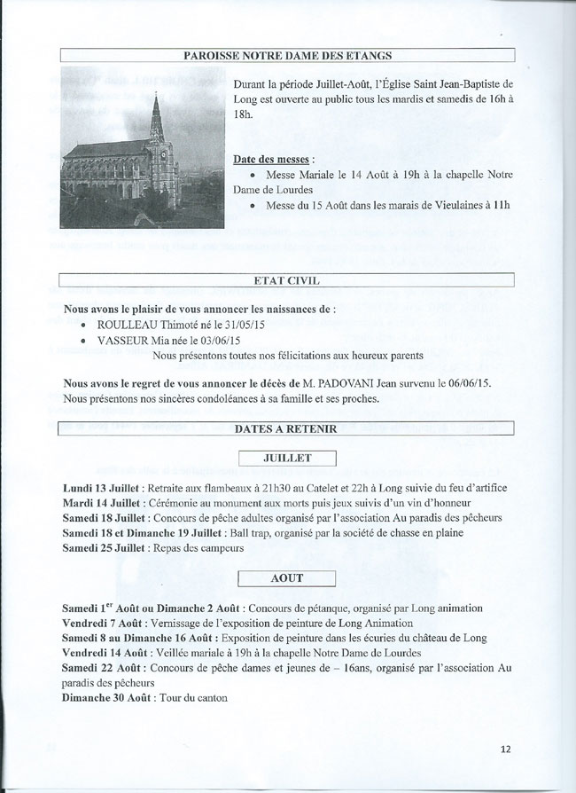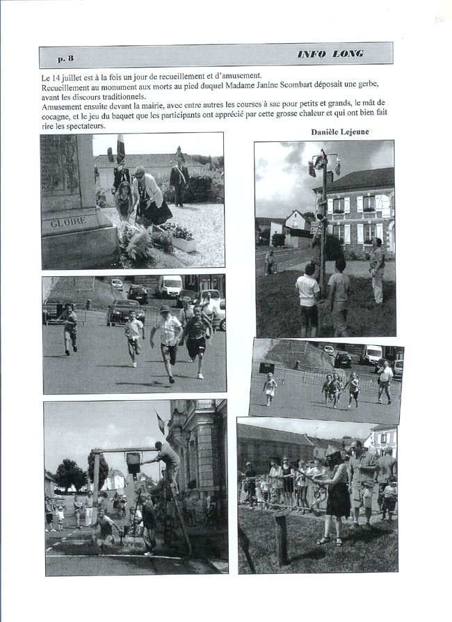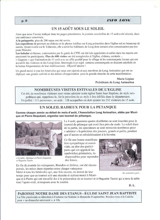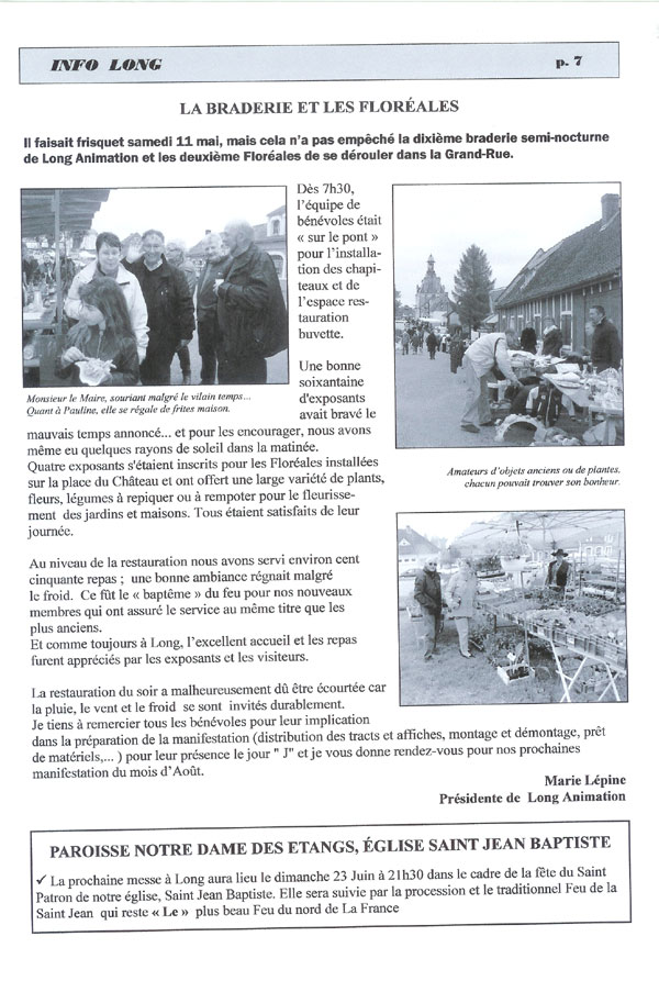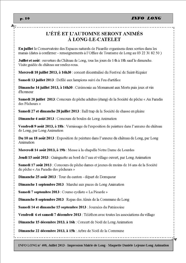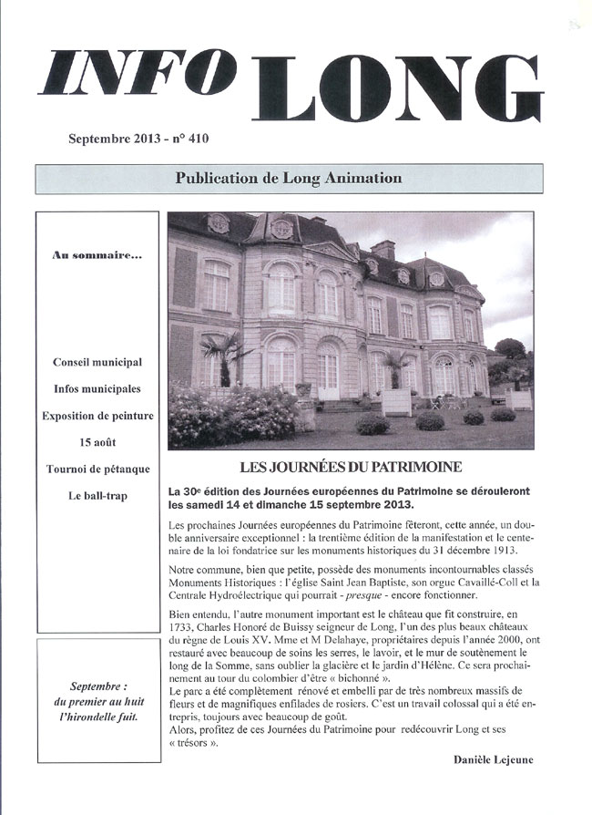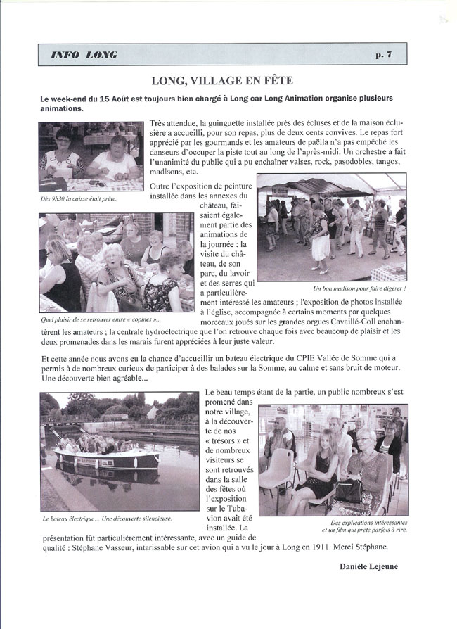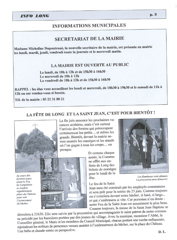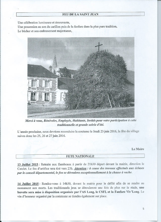 Tout d’abord, le dimanche 7 juin, le F.C. Long organisait son traditionnel tournoi, remettant en jeu le challenge Marcel Papin. Une fois de plus, il a connu un vif succès, bien que se déroulaient le même jour, les élections européennes et les communions solennelles et malgré un orage qui a un peu contrarié la fête, en fin de journée. La réussite de cette journée a été tant sur le plan sportif que sur celui de la convivialité. Je félicite les dirigeants du club et à leur tête, le Président, ainsi que tous les bénévoles, pour la bonne organisation de ce tournoi et surtout pour le maintien du souvenir et de la tradition… Et puisque l’occasion m’est donnée, je salue le club dans son ensemble, pour l’excellente saison réalisée, chez les petits comme chez les grands, avec, bien sûr, une mention particulière, pour la montée en quatrième division. Cette montée entraîne quelques aménagements, au niveau du terrain ; la commune sera aux côtés du club, pour qu’ils soient réalisés dans les meilleurs délais. Juin, c’est aussi le moment de la fête locale. Les manèges, loteries, tirs, autos tamponneuses ou autos scooters comme disent certains, ont, pendant trois jours, animé le cœur du village. Un grand merci aux majorettes (les Hirondelles), à la fanfare Viv’Long et au Club des jeunes pour l’animation proposée, le dimanche après midi, ce qui a permis de réunir un grand nombre de Longiniens sur la place de la mairie et de perpétuer l’esprit de cette fête locale… Dommage qu’il y ait eu quelques débordements. Et puis, nous avons vécu une « Saint Jean Baptiste » exceptionnelle, avec une très belle cérémonie religieuse dédiée à la lumière, animée par la chorale de Long au grand complet et par Geoffrey Chesnier à l’orgue, suivie d’une procession où les jeunes ont tenu une place importante, encadrés par les membres de la paroisse et accompagnés par Monsieur l’Abbé, les élus, la fanfare et les porteurs de flambeaux. Après que Monsieur l’Abbé ait béni le feu, le bûcher s’embrasa très vite (il est vrai que nous traversons une période de sécheresse et le bois était particulièrement bien sec). Une immense flamme est montée vers le ciel, caractérisant à merveille notre feu de Saint Jean et dégageant une intense chaleur… Le public, particulièrement nombreux, était comblé, même si, côté rue du Château, il a dû s’éloigner à cause des flammèches… Le service de sécurité veillait et tout s’est bien terminé… Nous avons eu, une fois encore, les honneurs de la télévision (France 3 et TF1) et bien sûr de la presse locale, qui a bien couvert l’évènement… Là aussi, au nom de toute la Municipalité, un grand merci à toutes celles et tous ceux qui se sont investis, dans la préparation du bûcher, dans sa surveillance, dans la préparation des cérémonies et dans leurs animations, dans la sécurité, dans la communication, pour que cet évènement soit à la hauteur de sa réputation. Ce fût le cas, bravo à tous. Pour en terminer avec les manifestations, je souhaite féliciter les enfants de l’école primaire de Long qui, sous l’égide de leurs enseignants, nous ont concoctés une superbe fête des écoles qui avait pour thème « les voyageurs du monde ». Il y avait beaucoup de spontanéité et d’authenticité dans ce spectacle, et nous avons vraiment passé un bon moment… Maintenant, place aux vacances ! Avec le beau temps, malgré une conjoncture économique toujours aussi difficile, les choses ne semblent pas trop mal se présenter. Avril, mai et juin ont plutôt été bons sur le plan de la fréquentation, même si l’on note une baisse du côté du château. Les équipements d’accueil sont pratiquement prêts pour la haute saison touristique ; souhaitons qu’elle soit bonne, que les estivants soient le plus nombreux possible et que tous les évènements locaux qui vont être organisés tout au long de cette période estivale rencontrent le plein succès.