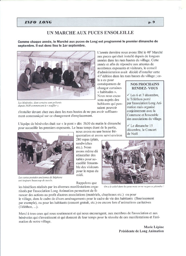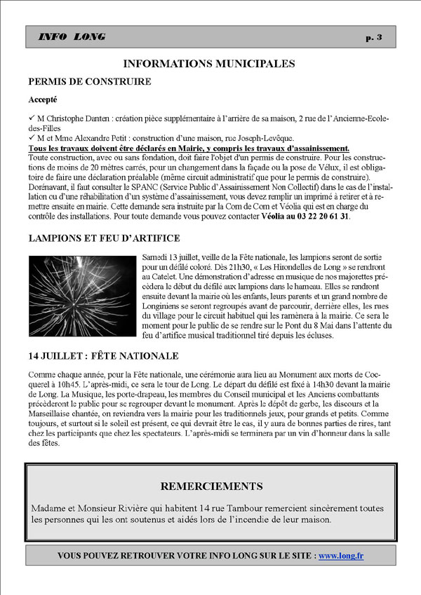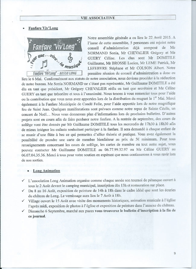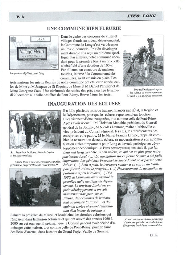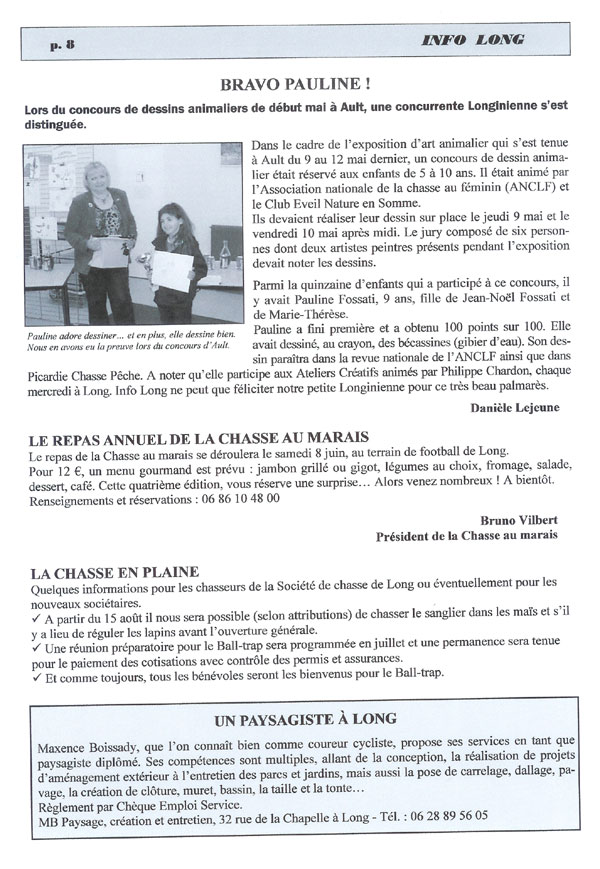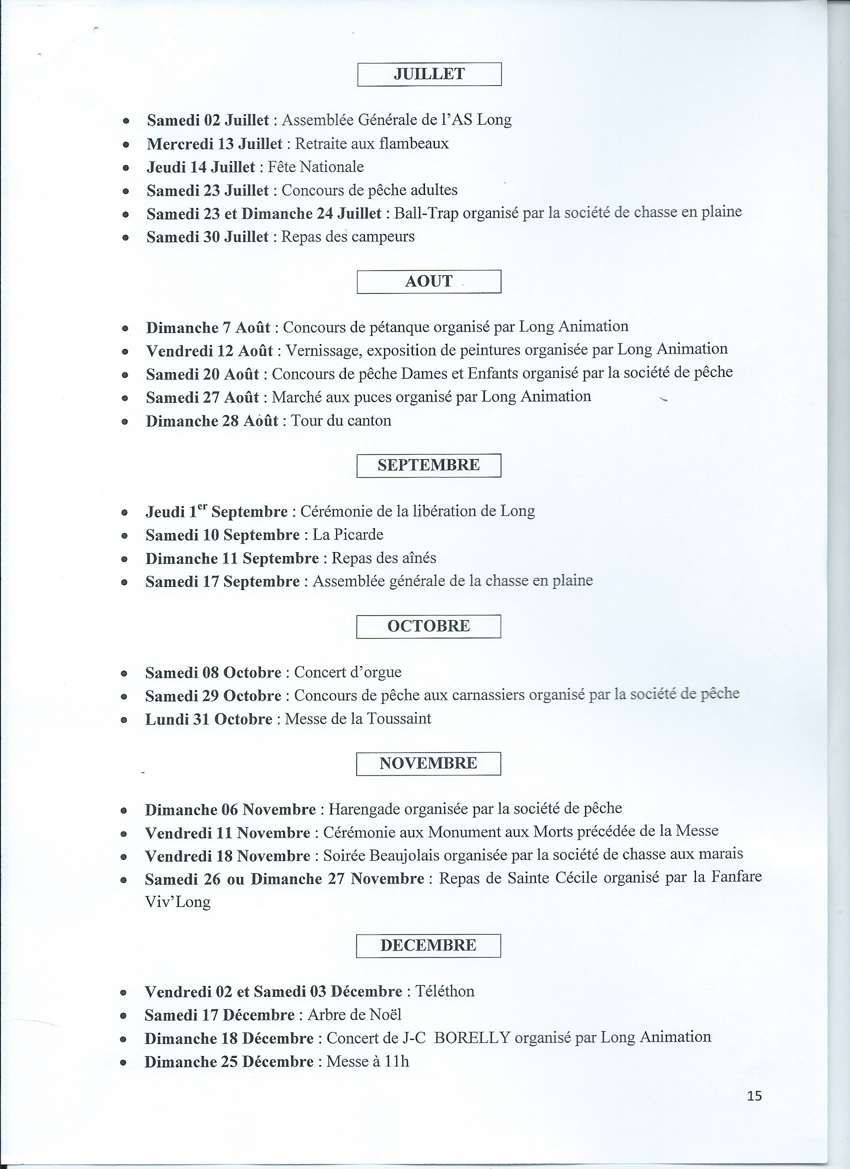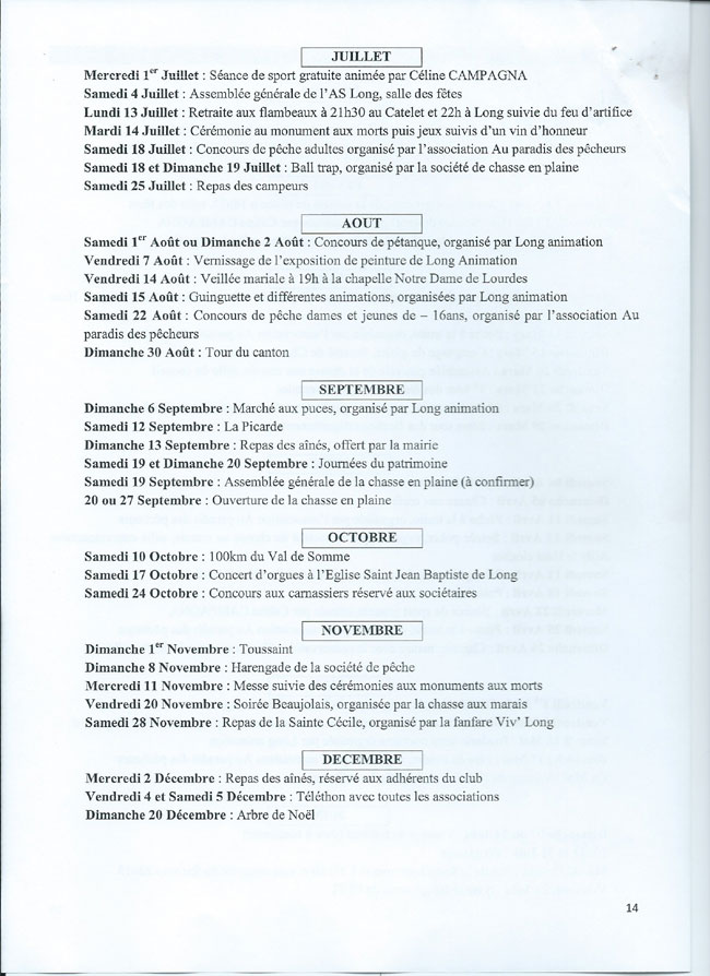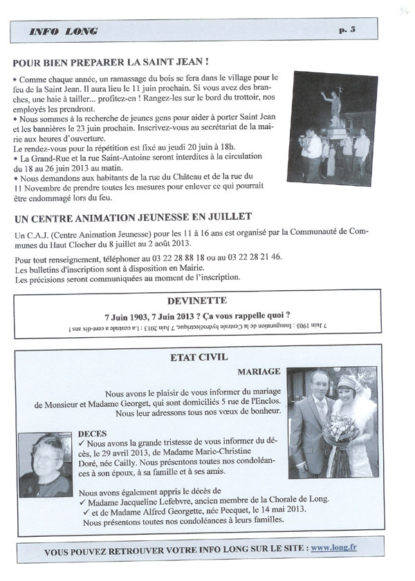 Tout d’abord, le dimanche 7 juin, le F.C. Long organisait son traditionnel tournoi, remettant en jeu le challenge Marcel Papin. Une fois de plus, il a connu un vif succès, bien que se déroulaient le même jour, les élections européennes et les communions solennelles et malgré un orage qui a un peu contrarié la fête, en fin de journée. La réussite de cette journée a été tant sur le plan sportif que sur celui de la convivialité. Je félicite les dirigeants du club et à leur tête, le Président, ainsi que tous les bénévoles, pour la bonne organisation de ce tournoi et surtout pour le maintien du souvenir et de la tradition… Et puisque l’occasion m’est donnée, je salue le club dans son ensemble, pour l’excellente saison réalisée, chez les petits comme chez les grands, avec, bien sûr, une mention particulière, pour la montée en quatrième division. Cette montée entraîne quelques aménagements, au niveau du terrain ; la commune sera aux côtés du club, pour qu’ils soient réalisés dans les meilleurs délais. Juin, c’est aussi le moment de la fête locale. Les manèges, loteries, tirs, autos tamponneuses ou autos scooters comme disent certains, ont, pendant trois jours, animé le cœur du village. Un grand merci aux majorettes (les Hirondelles), à la fanfare Viv’Long et au Club des jeunes pour l’animation proposée, le dimanche après midi, ce qui a permis de réunir un grand nombre de Longiniens sur la place de la mairie et de perpétuer l’esprit de cette fête locale… Dommage qu’il y ait eu quelques débordements. Et puis, nous avons vécu une « Saint Jean Baptiste » exceptionnelle, avec une très belle cérémonie religieuse dédiée à la lumière, animée par la chorale de Long au grand complet et par Geoffrey Chesnier à l’orgue, suivie d’une procession où les jeunes ont tenu une place importante, encadrés par les membres de la paroisse et accompagnés par Monsieur l’Abbé, les élus, la fanfare et les porteurs de flambeaux. Après que Monsieur l’Abbé ait béni le feu, le bûcher s’embrasa très vite (il est vrai que nous traversons une période de sécheresse et le bois était particulièrement bien sec). Une immense flamme est montée vers le ciel, caractérisant à merveille notre feu de Saint Jean et dégageant une intense chaleur… Le public, particulièrement nombreux, était comblé, même si, côté rue du Château, il a dû s’éloigner à cause des flammèches… Le service de sécurité veillait et tout s’est bien terminé… Nous avons eu, une fois encore, les honneurs de la télévision (France 3 et TF1) et bien sûr de la presse locale, qui a bien couvert l’évènement… Là aussi, au nom de toute la Municipalité, un grand merci à toutes celles et tous ceux qui se sont investis, dans la préparation du bûcher, dans sa surveillance, dans la préparation des cérémonies et dans leurs animations, dans la sécurité, dans la communication, pour que cet évènement soit à la hauteur de sa réputation. Ce fût le cas, bravo à tous. Pour en terminer avec les manifestations, je souhaite féliciter les enfants de l’école primaire de Long qui, sous l’égide de leurs enseignants, nous ont concoctés une superbe fête des écoles qui avait pour thème « les voyageurs du monde ». Il y avait beaucoup de spontanéité et d’authenticité dans ce spectacle, et nous avons vraiment passé un bon moment… Maintenant, place aux vacances ! Avec le beau temps, malgré une conjoncture économique toujours aussi difficile, les choses ne semblent pas trop mal se présenter. Avril, mai et juin ont plutôt été bons sur le plan de la fréquentation, même si l’on note une baisse du côté du château. Les équipements d’accueil sont pratiquement prêts pour la haute saison touristique ; souhaitons qu’elle soit bonne, que les estivants soient le plus nombreux possible et que tous les évènements locaux qui vont être organisés tout au long de cette période estivale rencontrent le plein succès.
