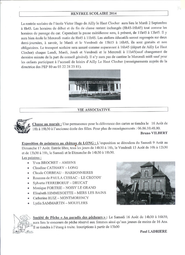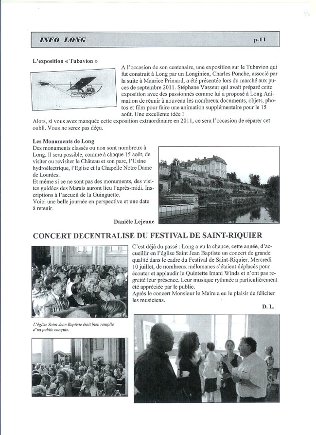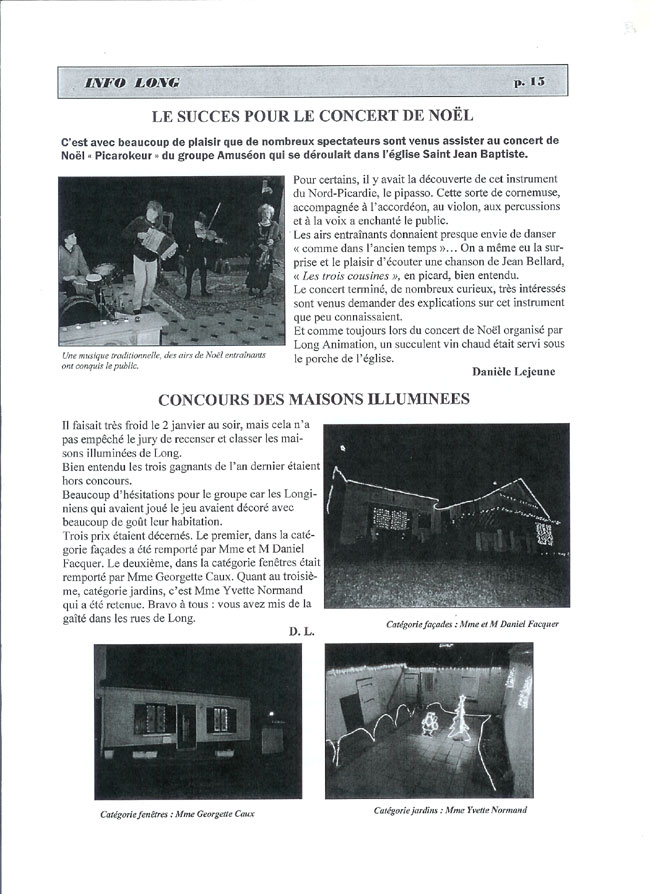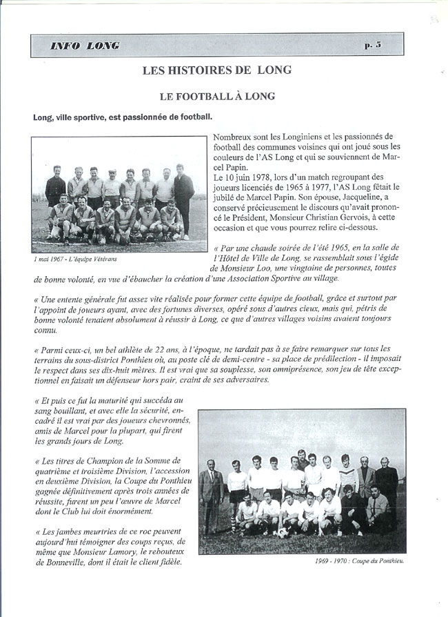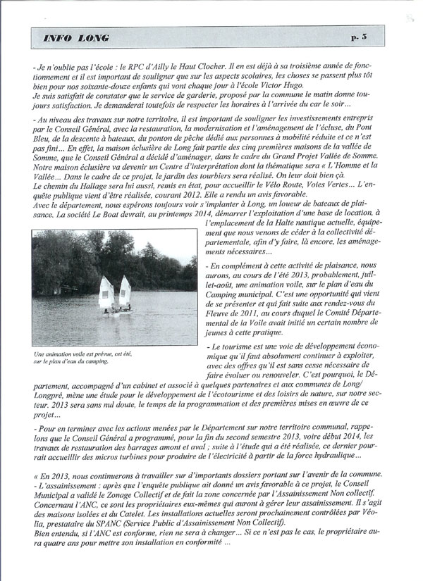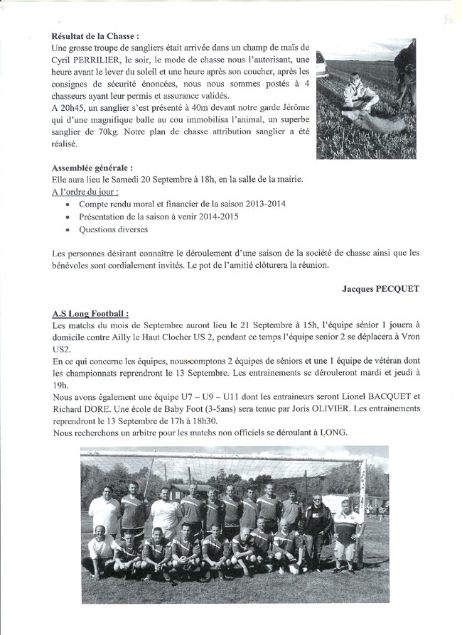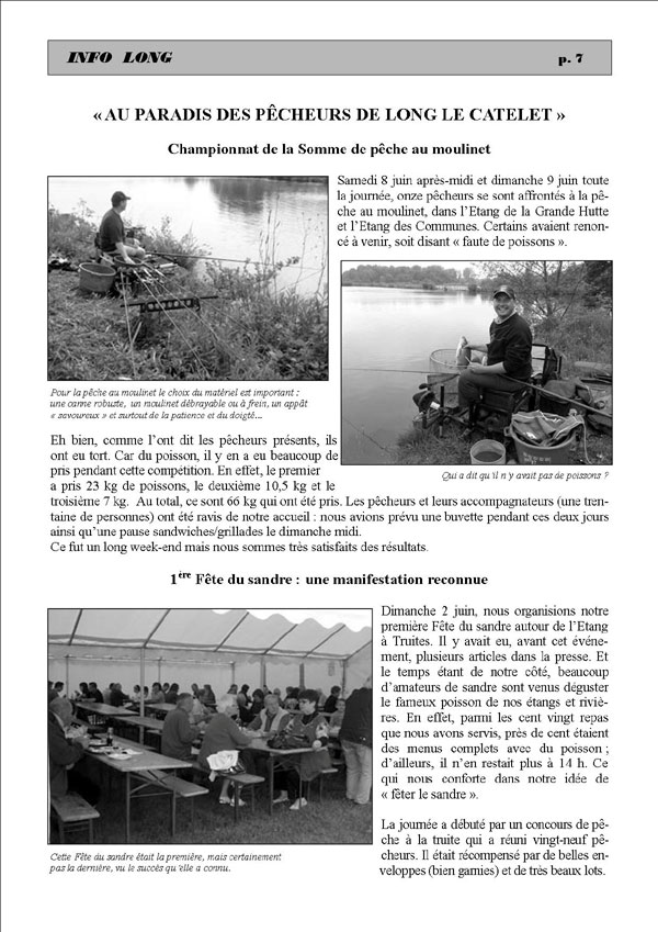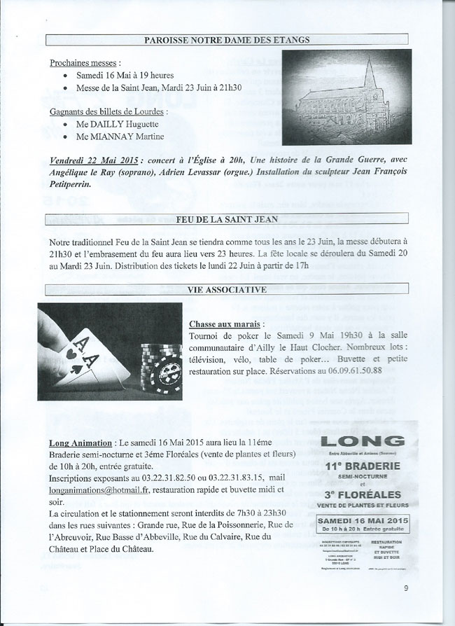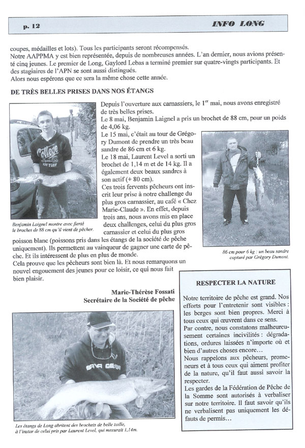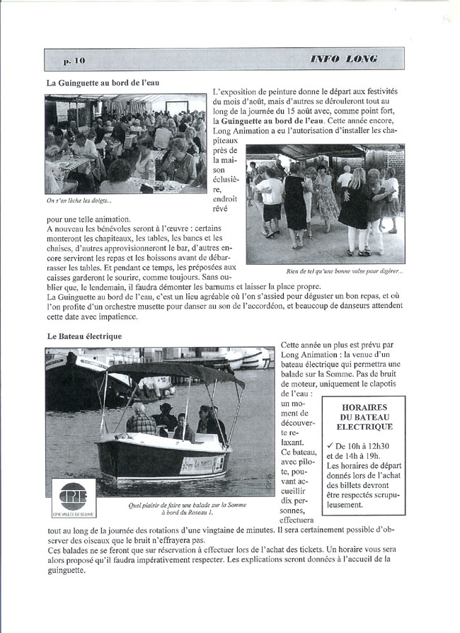 Tout d’abord, le dimanche 7 juin, le F.C. Long organisait son traditionnel tournoi, remettant en jeu le challenge Marcel Papin. Une fois de plus, il a connu un vif succès, bien que se déroulaient le même jour, les élections européennes et les communions solennelles et malgré un orage qui a un peu contrarié la fête, en fin de journée. La réussite de cette journée a été tant sur le plan sportif que sur celui de la convivialité. Je félicite les dirigeants du club et à leur tête, le Président, ainsi que tous les bénévoles, pour la bonne organisation de ce tournoi et surtout pour le maintien du souvenir et de la tradition… Et puisque l’occasion m’est donnée, je salue le club dans son ensemble, pour l’excellente saison réalisée, chez les petits comme chez les grands, avec, bien sûr, une mention particulière, pour la montée en quatrième division. Cette montée entraîne quelques aménagements, au niveau du terrain ; la commune sera aux côtés du club, pour qu’ils soient réalisés dans les meilleurs délais. Juin, c’est aussi le moment de la fête locale. Les manèges, loteries, tirs, autos tamponneuses ou autos scooters comme disent certains, ont, pendant trois jours, animé le cœur du village. Un grand merci aux majorettes (les Hirondelles), à la fanfare Viv’Long et au Club des jeunes pour l’animation proposée, le dimanche après midi, ce qui a permis de réunir un grand nombre de Longiniens sur la place de la mairie et de perpétuer l’esprit de cette fête locale… Dommage qu’il y ait eu quelques débordements. Et puis, nous avons vécu une « Saint Jean Baptiste » exceptionnelle, avec une très belle cérémonie religieuse dédiée à la lumière, animée par la chorale de Long au grand complet et par Geoffrey Chesnier à l’orgue, suivie d’une procession où les jeunes ont tenu une place importante, encadrés par les membres de la paroisse et accompagnés par Monsieur l’Abbé, les élus, la fanfare et les porteurs de flambeaux. Après que Monsieur l’Abbé ait béni le feu, le bûcher s’embrasa très vite (il est vrai que nous traversons une période de sécheresse et le bois était particulièrement bien sec). Une immense flamme est montée vers le ciel, caractérisant à merveille notre feu de Saint Jean et dégageant une intense chaleur… Le public, particulièrement nombreux, était comblé, même si, côté rue du Château, il a dû s’éloigner à cause des flammèches… Le service de sécurité veillait et tout s’est bien terminé… Nous avons eu, une fois encore, les honneurs de la télévision (France 3 et TF1) et bien sûr de la presse locale, qui a bien couvert l’évènement… Là aussi, au nom de toute la Municipalité, un grand merci à toutes celles et tous ceux qui se sont investis, dans la préparation du bûcher, dans sa surveillance, dans la préparation des cérémonies et dans leurs animations, dans la sécurité, dans la communication, pour que cet évènement soit à la hauteur de sa réputation. Ce fût le cas, bravo à tous. Pour en terminer avec les manifestations, je souhaite féliciter les enfants de l’école primaire de Long qui, sous l’égide de leurs enseignants, nous ont concoctés une superbe fête des écoles qui avait pour thème « les voyageurs du monde ». Il y avait beaucoup de spontanéité et d’authenticité dans ce spectacle, et nous avons vraiment passé un bon moment… Maintenant, place aux vacances ! Avec le beau temps, malgré une conjoncture économique toujours aussi difficile, les choses ne semblent pas trop mal se présenter. Avril, mai et juin ont plutôt été bons sur le plan de la fréquentation, même si l’on note une baisse du côté du château. Les équipements d’accueil sont pratiquement prêts pour la haute saison touristique ; souhaitons qu’elle soit bonne, que les estivants soient le plus nombreux possible et que tous les évènements locaux qui vont être organisés tout au long de cette période estivale rencontrent le plein succès.