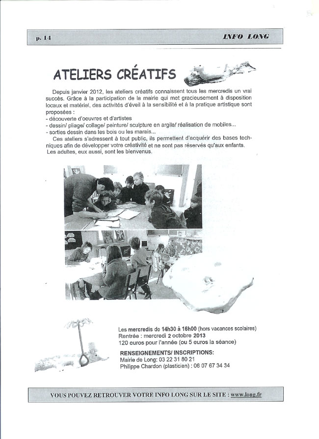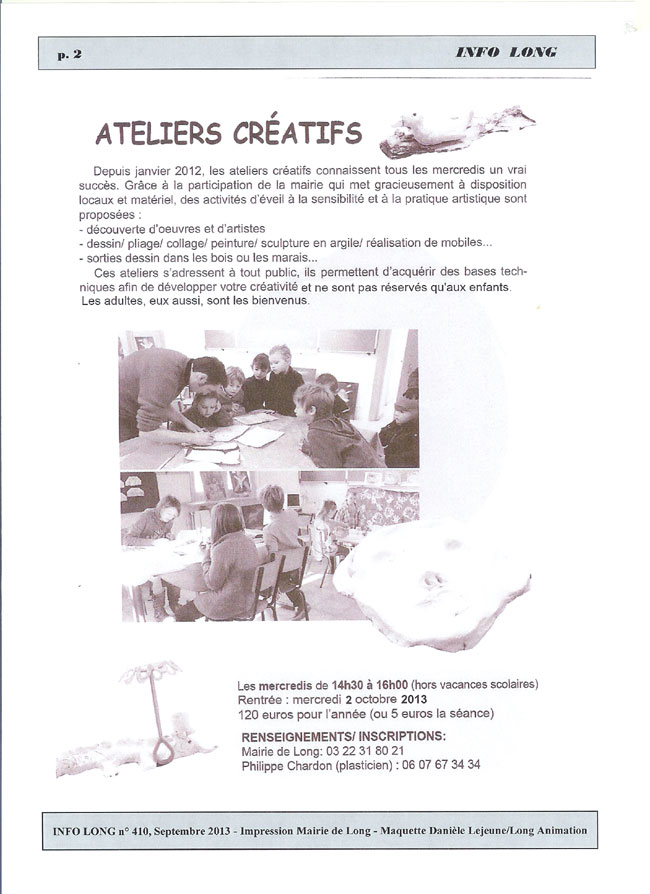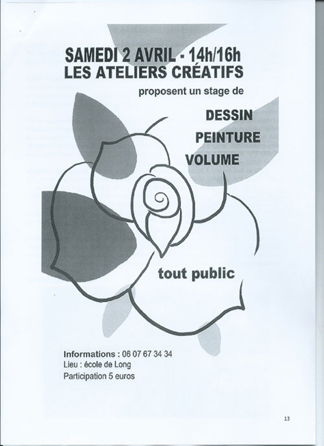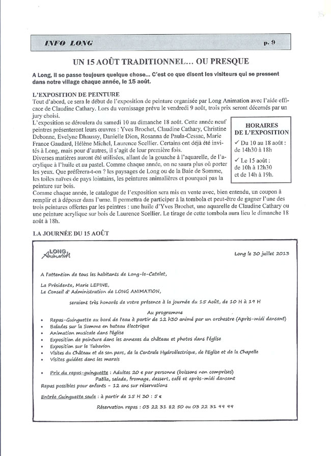 Comme chaque année au mois d’août, Long Animation organise une exposition de peinture. Celle-ci se déroulera du 14 au 23 août dans l’annexe du château de Long. Et, comme toujours, le catalogue de l’exposition permettra de participer à une tombola afin de gagner un tableau.