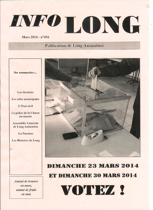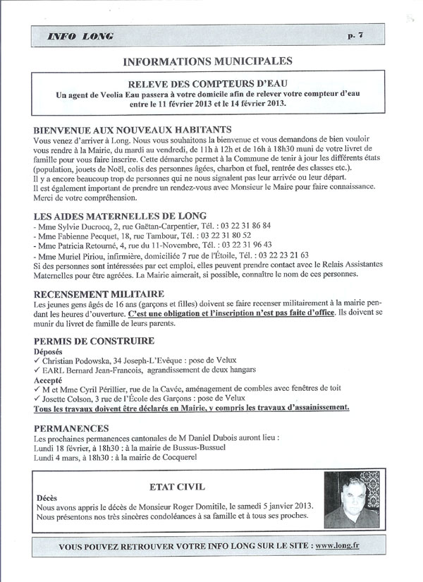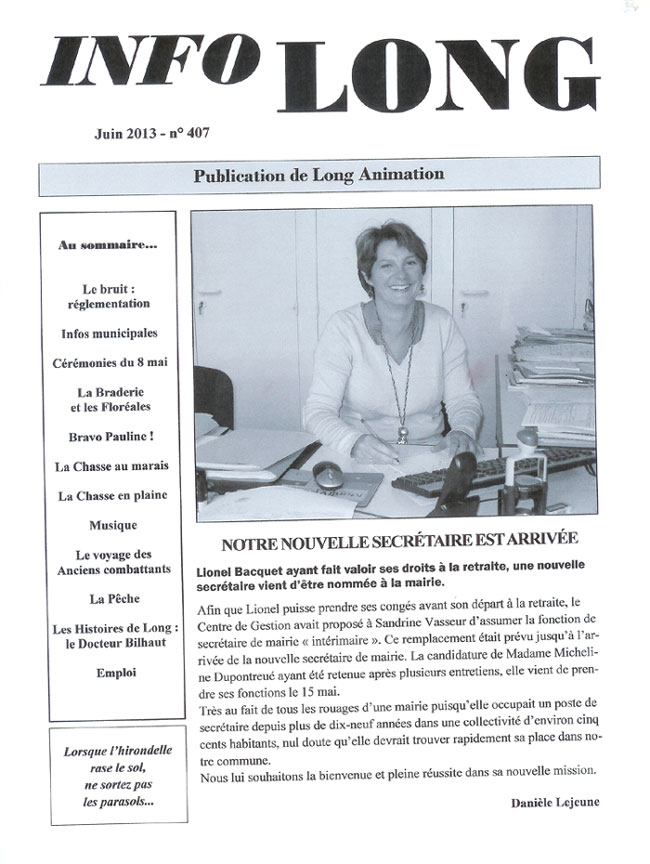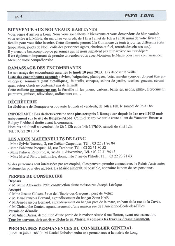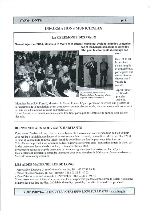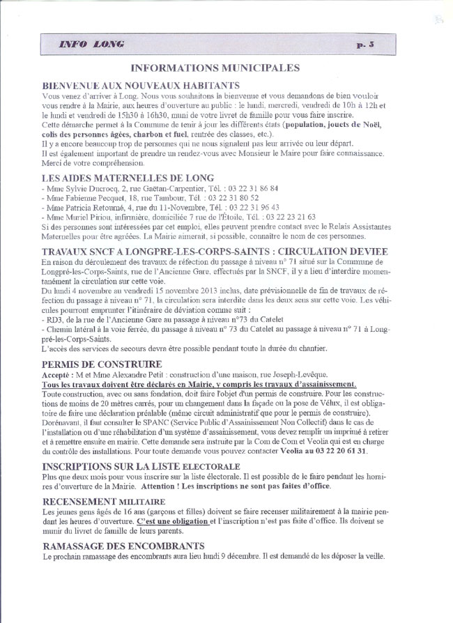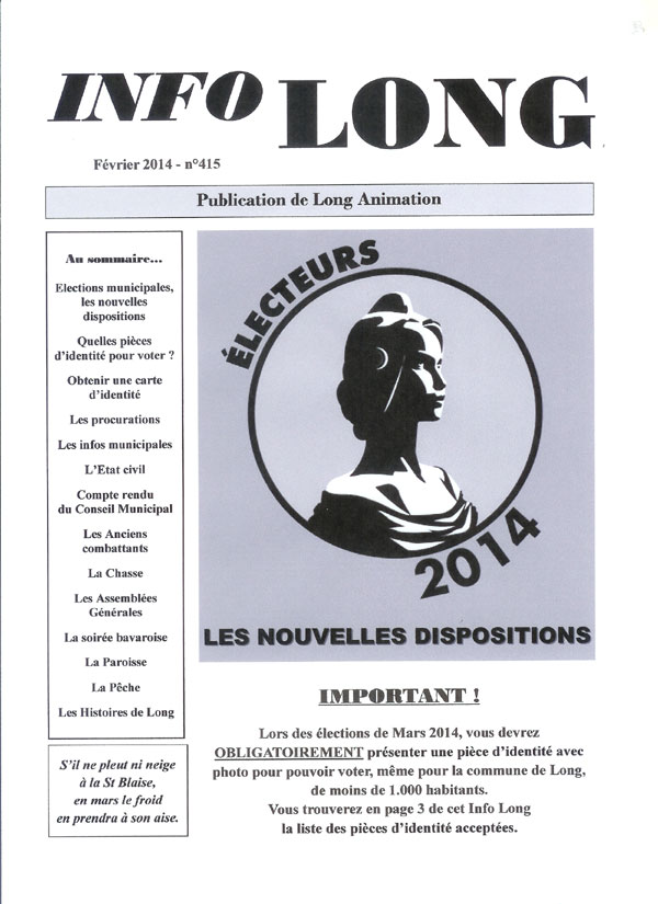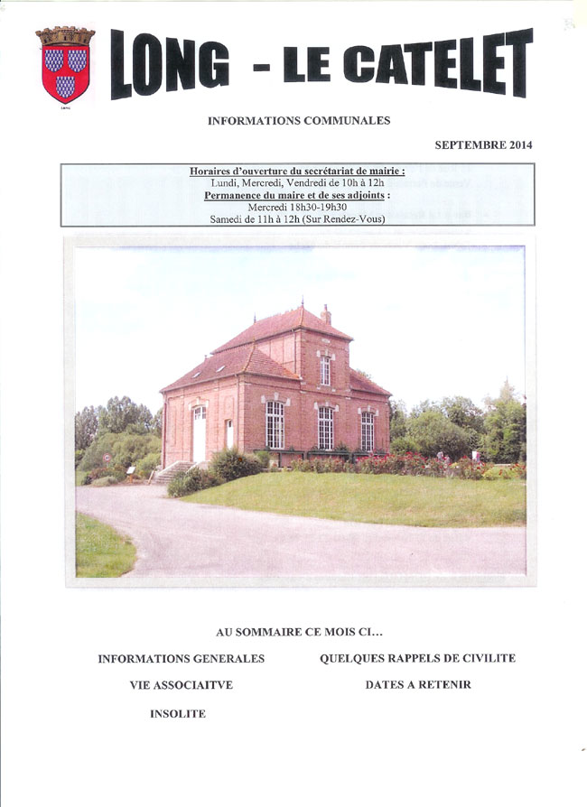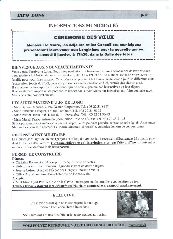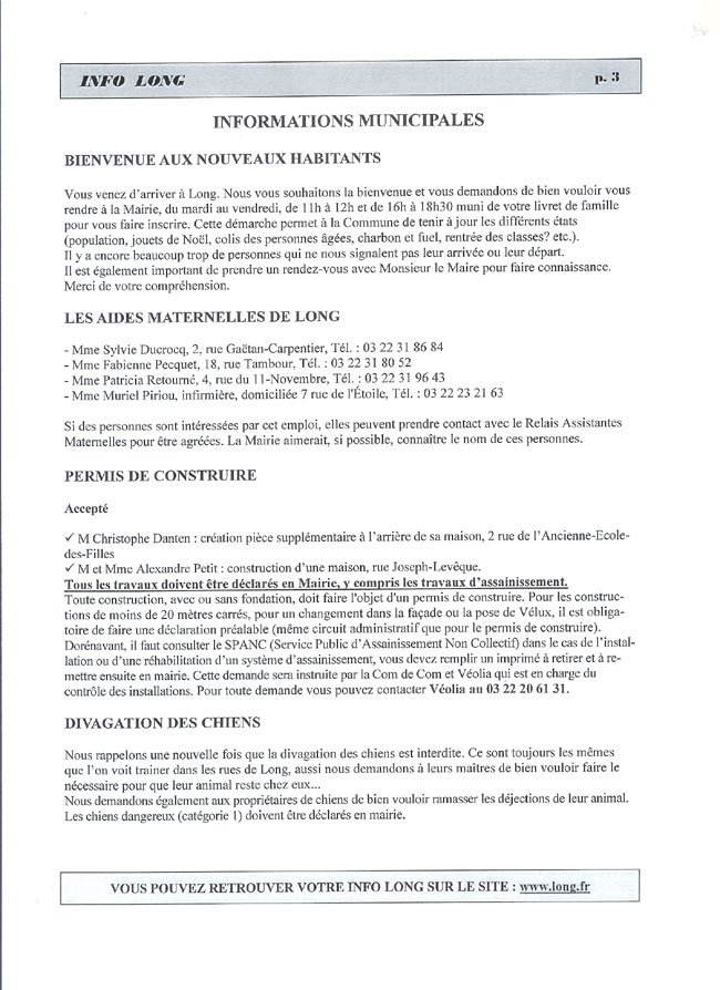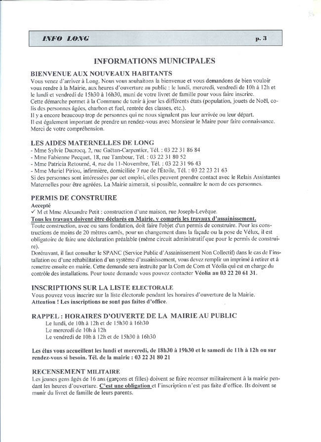 Nous souhaitons la bienvenue aux nouveaux habitants de Long et nous leur demandons de bien vouloir se rendre à la Mairie, du mardi au vendredi, de 11h à 12h et de 16h à 18h30 munis de leur livret de famille pour se faire inscrire. Cette démarche permet à la Commune de tenir à jour les différents états (population, jouets de Noël, colis des personnes âgées, charbon et fuel, rentrée des classes etc.). Alors si vous venez d'arriver à Long, n'oubliez pas de passer à la Mairie : c'est une démarche importante pour nous.