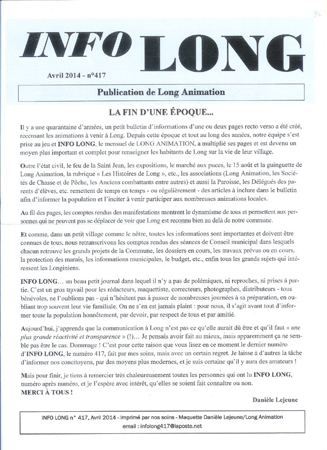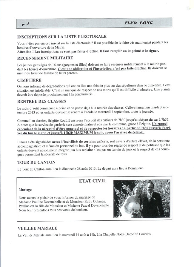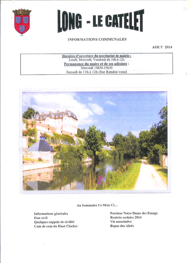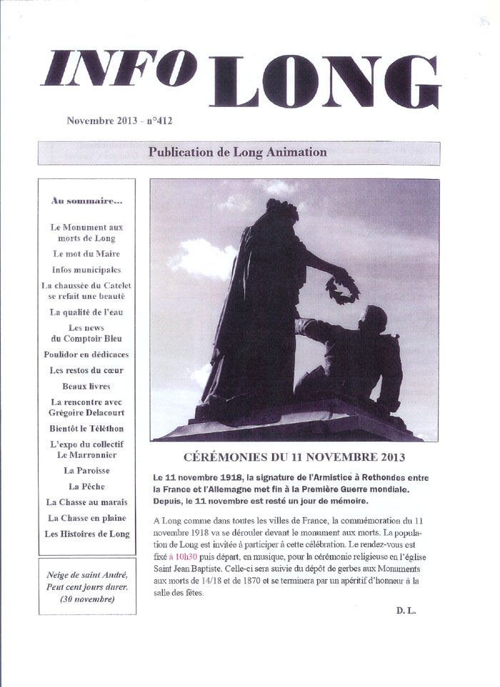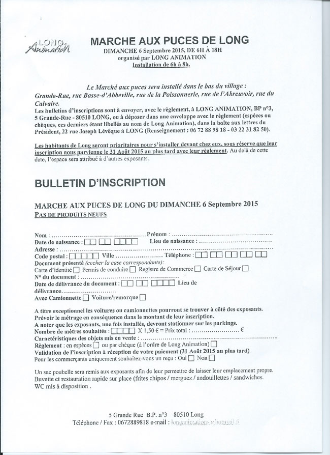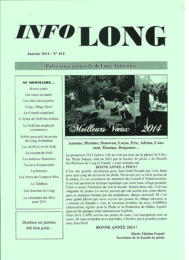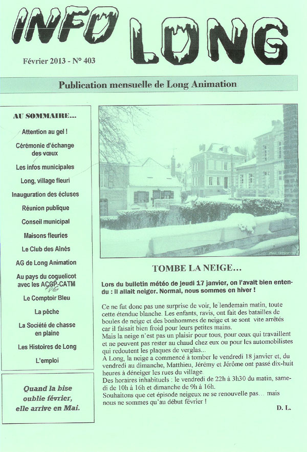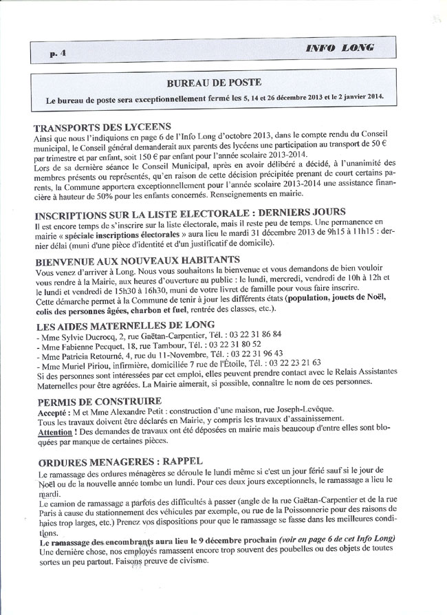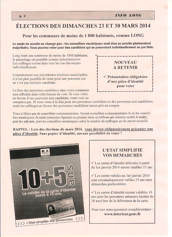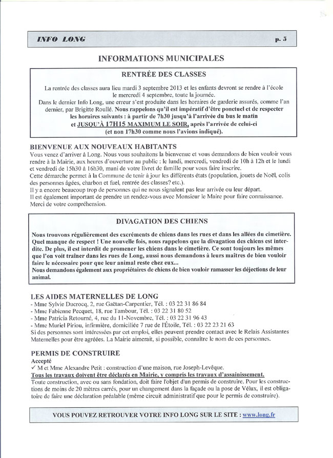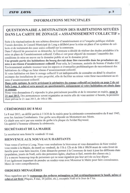 Nous souhaitons la bienvenue aux nouveaux habitants de Long et nous leur demandons de bien vouloir se rendre à la Mairie, du mardi au vendredi, de 11h à 12h et de 16h à 18h30 munis de leur livret de famille pour se faire inscrire. Cette démarche permet à la Commune de tenir à jour les différents états (population, jouets de Noël, colis des personnes âgées, charbon et fuel, rentrée des classes etc.). Alors si vous venez d'arriver à Long, n'oubliez pas de passer à la Mairie : c'est une démarche importante pour nous.