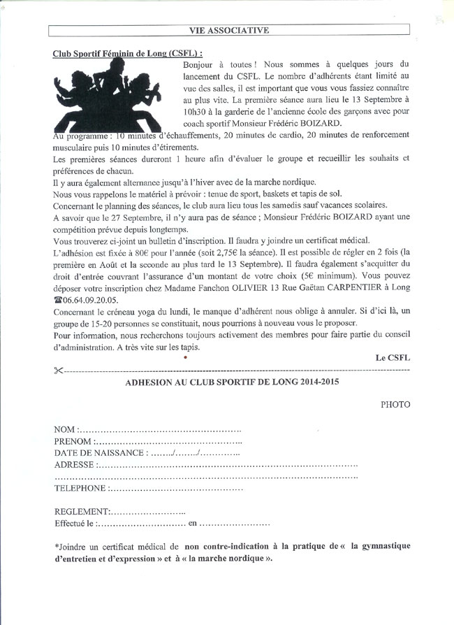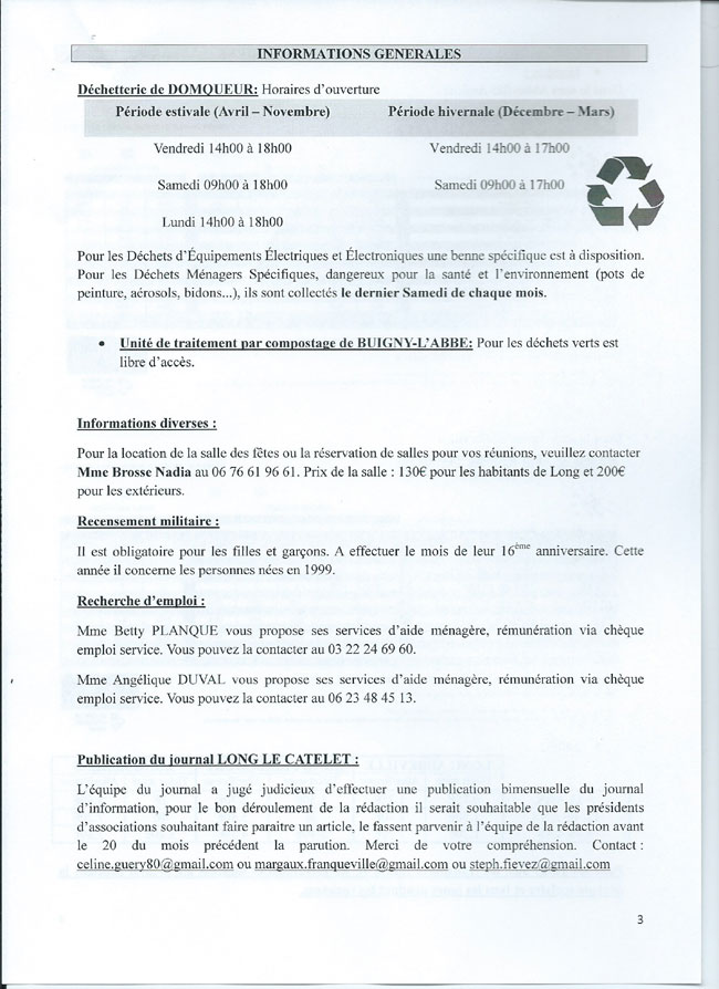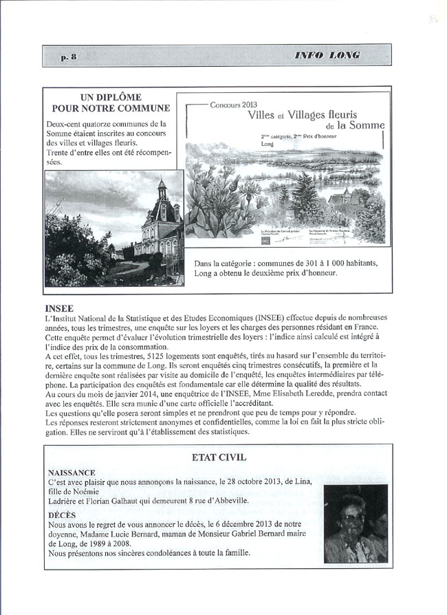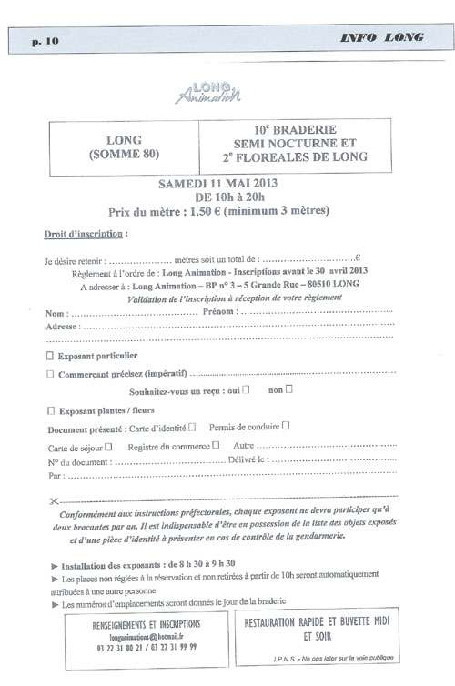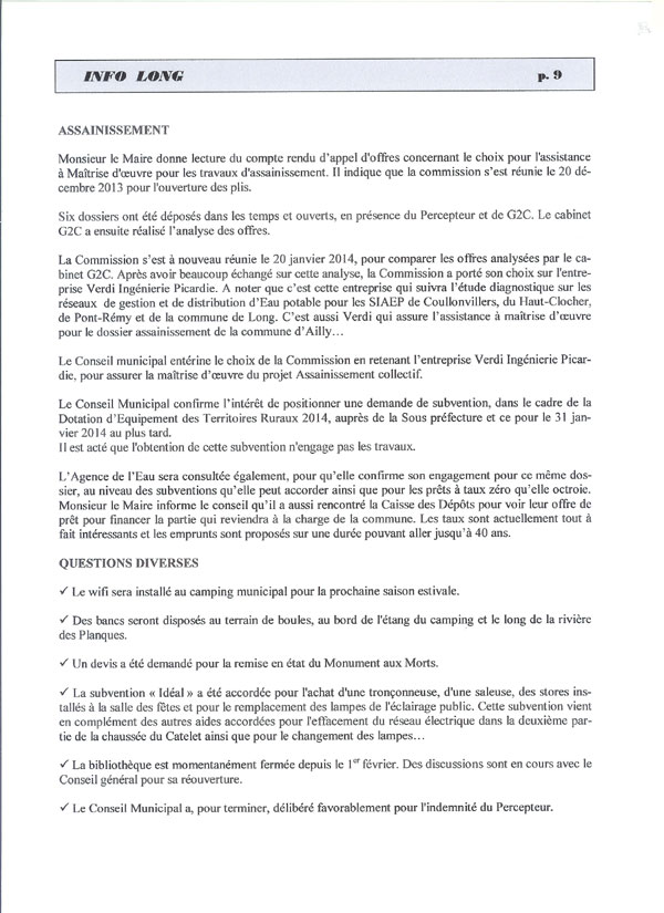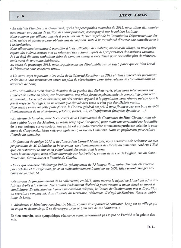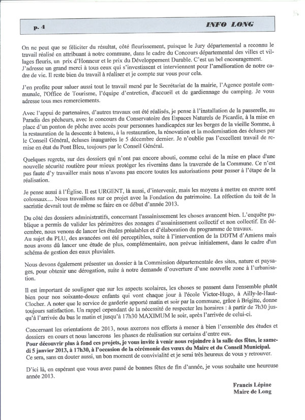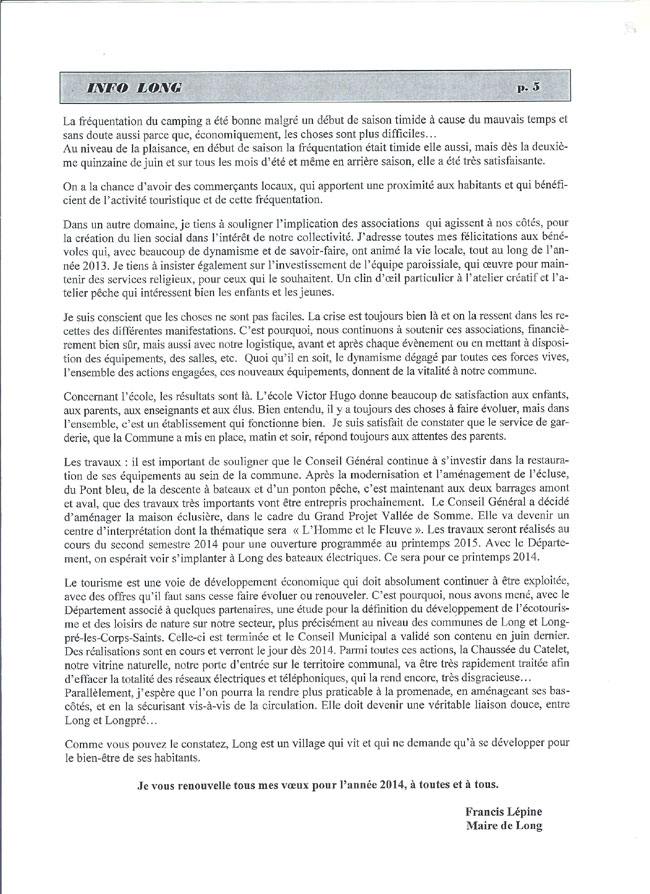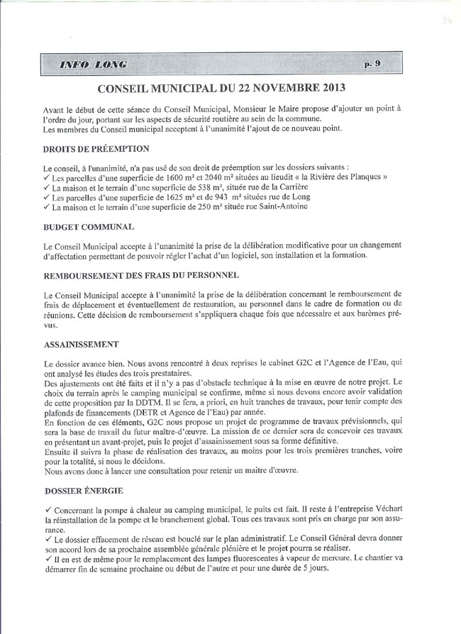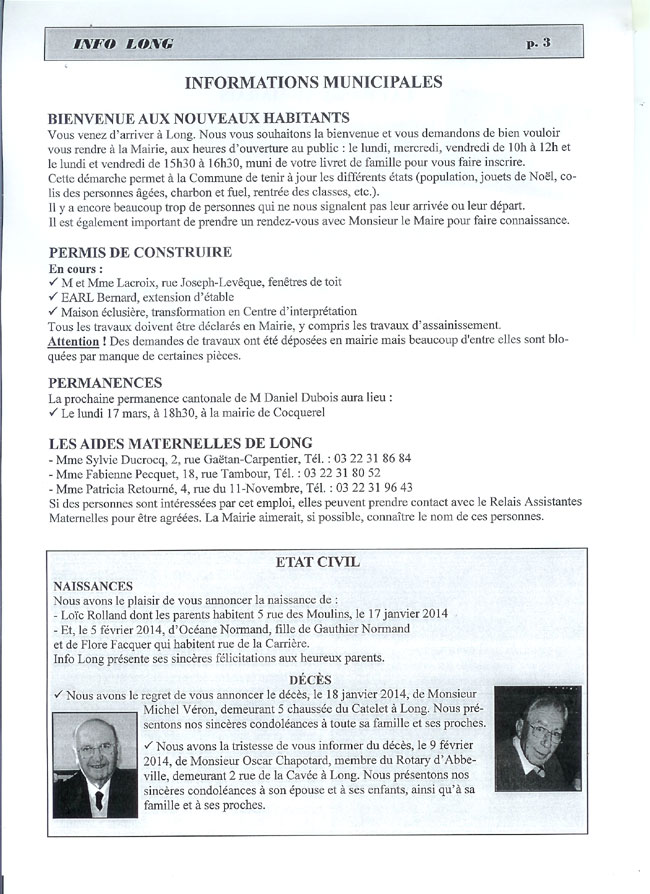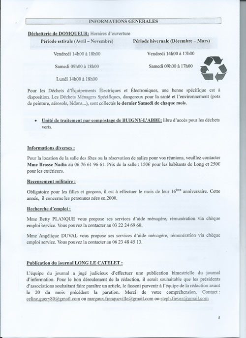 Nous souhaitons la bienvenue aux nouveaux habitants de Long et nous leur demandons de bien vouloir se rendre à la Mairie, du mardi au vendredi, de 11h à 12h et de 16h à 18h30 munis de leur livret de famille pour se faire inscrire. Cette démarche permet à la Commune de tenir à jour les différents états (population, jouets de Noël, colis des personnes âgées, charbon et fuel, rentrée des classes etc.). Alors si vous venez d'arriver à Long, n'oubliez pas de passer à la Mairie : c'est une démarche importante pour nous.