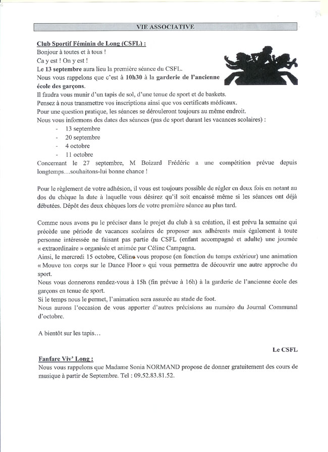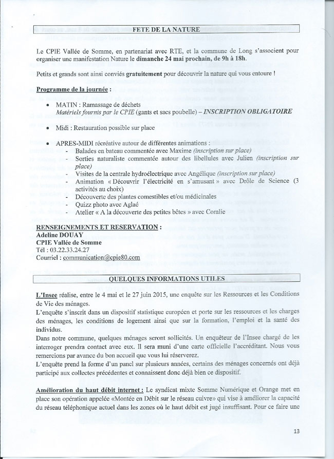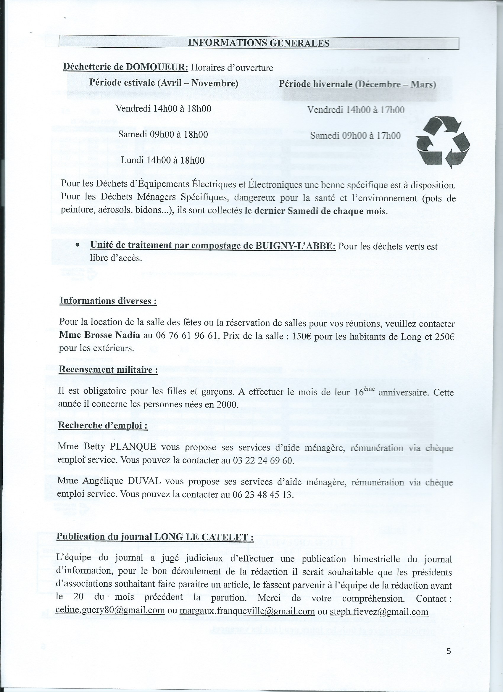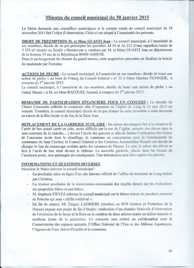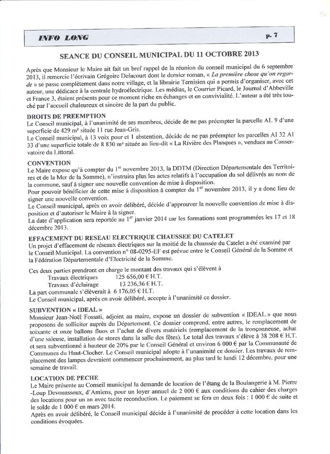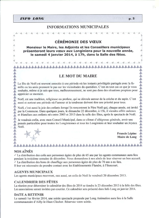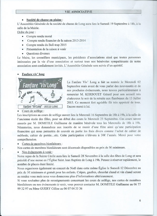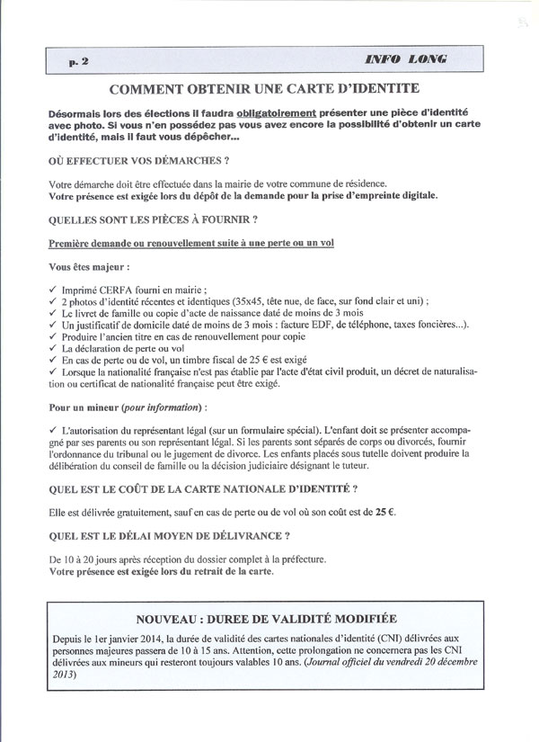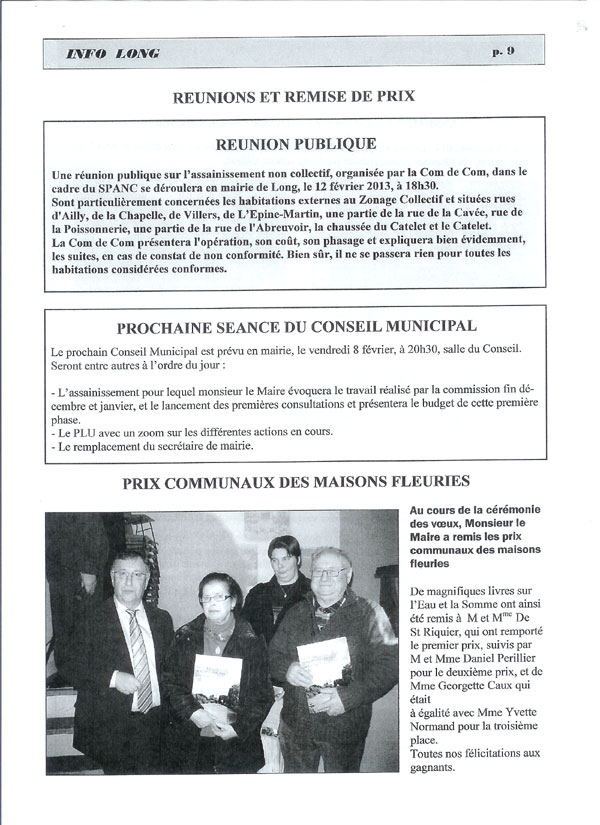 Nous souhaitons la bienvenue aux nouveaux habitants de Long et nous leur demandons de bien vouloir se rendre à la Mairie, du mardi au vendredi, de 11h à 12h et de 16h à 18h30 munis de leur livret de famille pour se faire inscrire. Cette démarche permet à la Commune de tenir à jour les différents états (population, jouets de Noël, colis des personnes âgées, charbon et fuel, rentrée des classes etc.). Alors si vous venez d'arriver à Long, n'oubliez pas de passer à la Mairie : c'est une démarche importante pour nous.