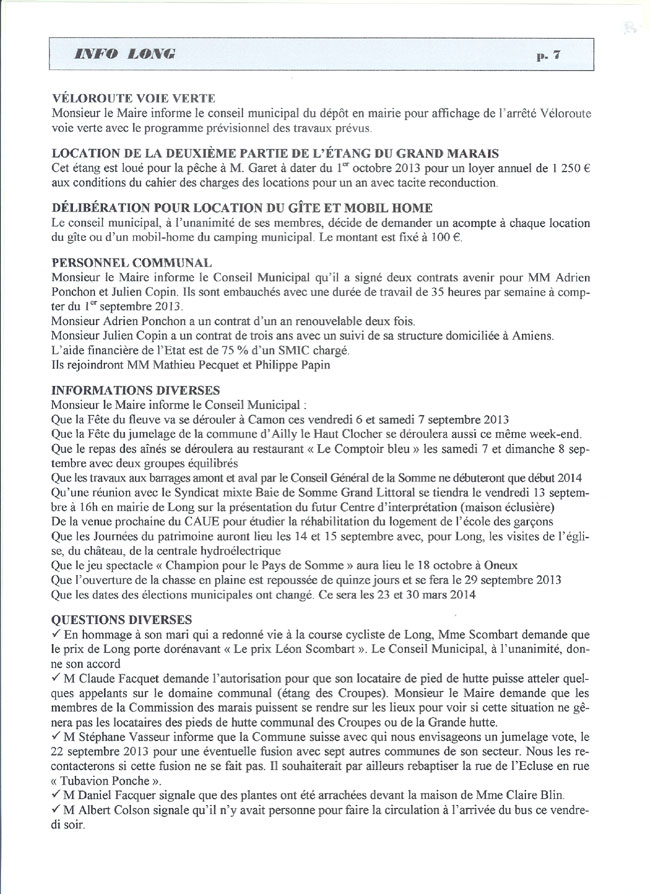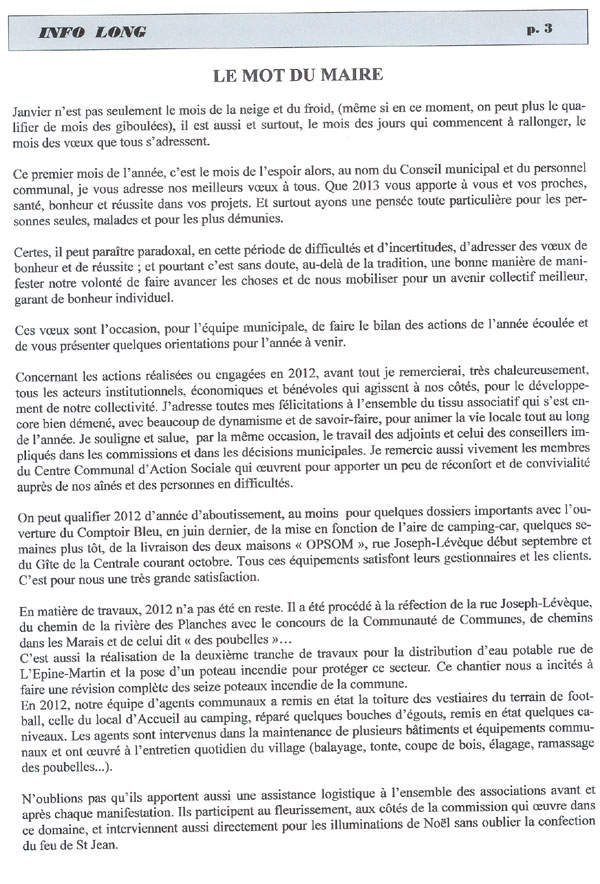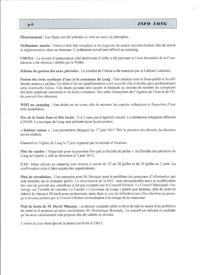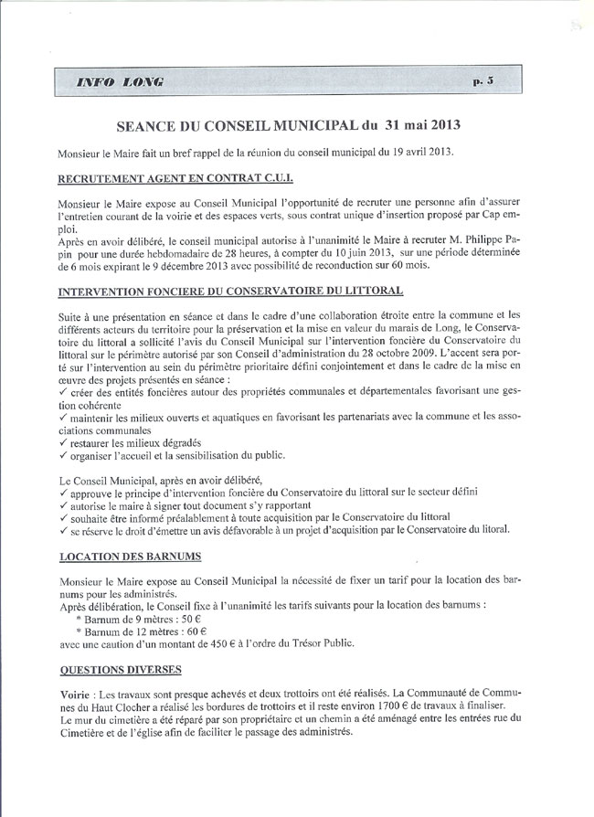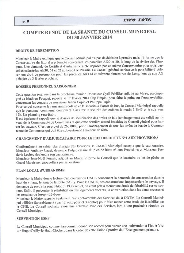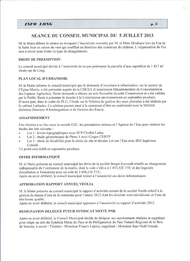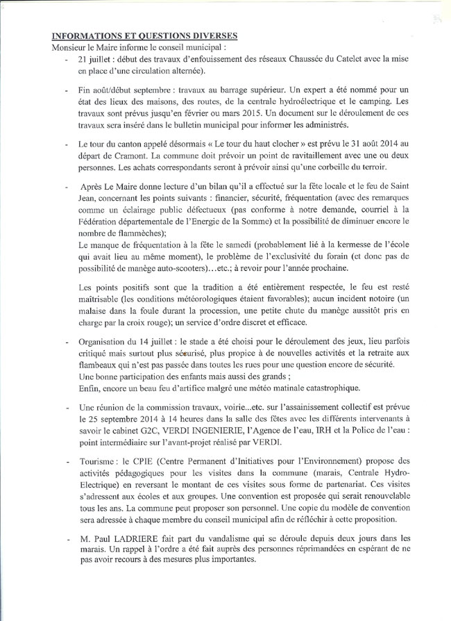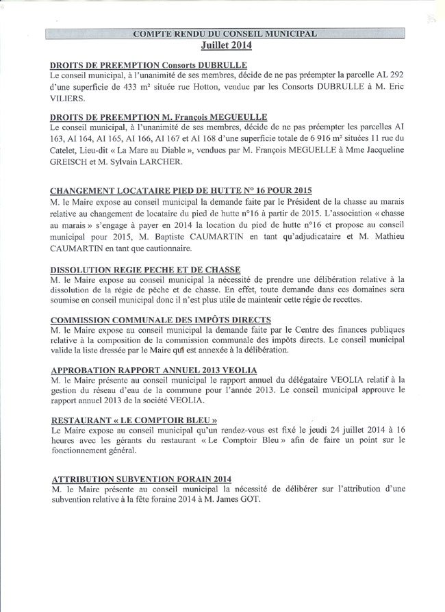 Le Conseil Municipal quant à lui, aura à plancher sur certains dossiers dans les prochaines semaines, pour traiter les réponses à notre appel d’offre sur la gestion de l’Eau, pour donner une suite au passage des services du Conseil Général dans la commune, le 19 juin dernier, pour avancer sur les locations des lots de pêche et pieds de hutte et pour évoquer la Commission départementale de la coopération intercommunale… Et, bien sûr, le Conseil Municipal vous donne rendez vous, les 13 et 14 juillet, pour célébrer ensemble la fête nationale. Des surprises vous y attendent… Francis Lépine