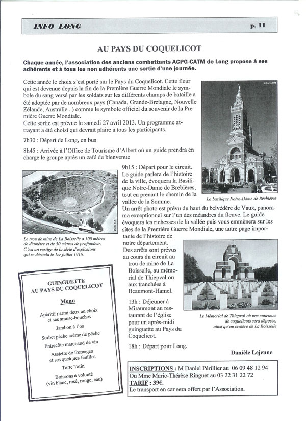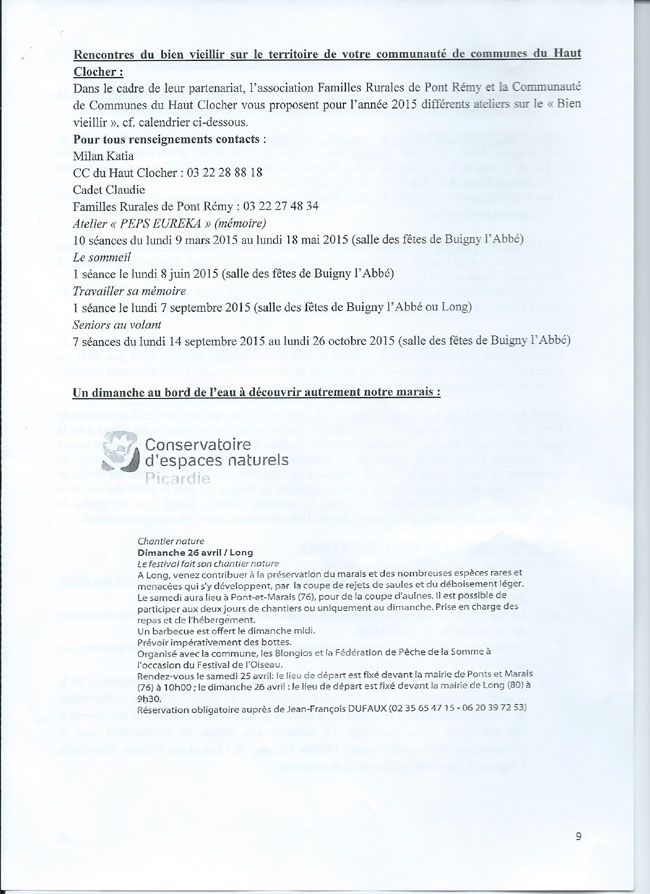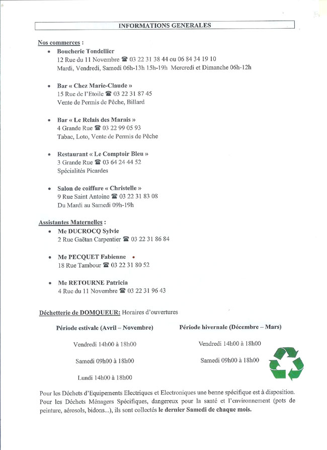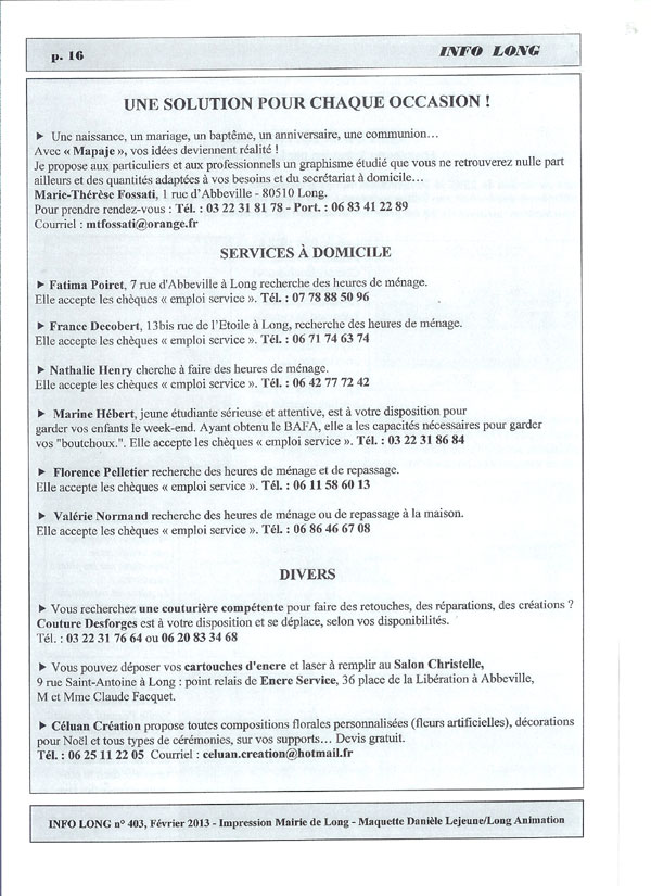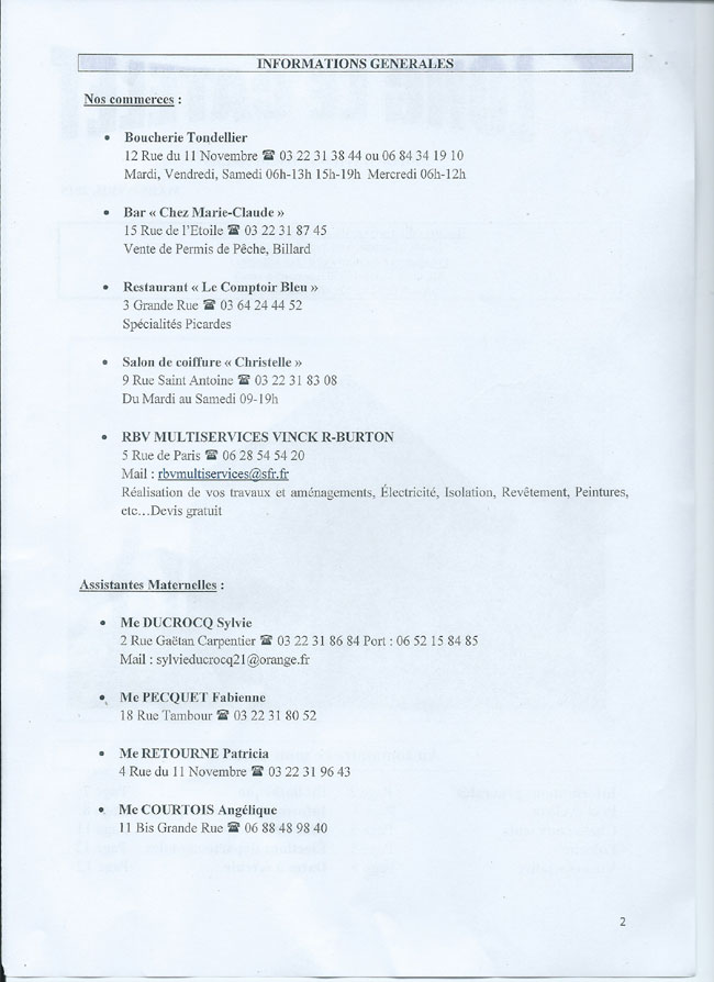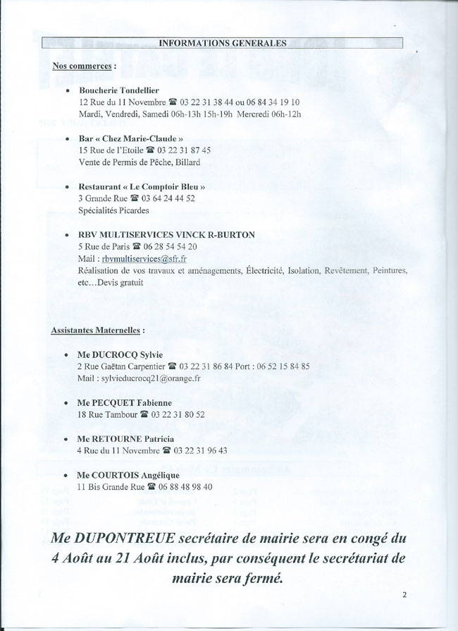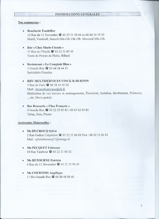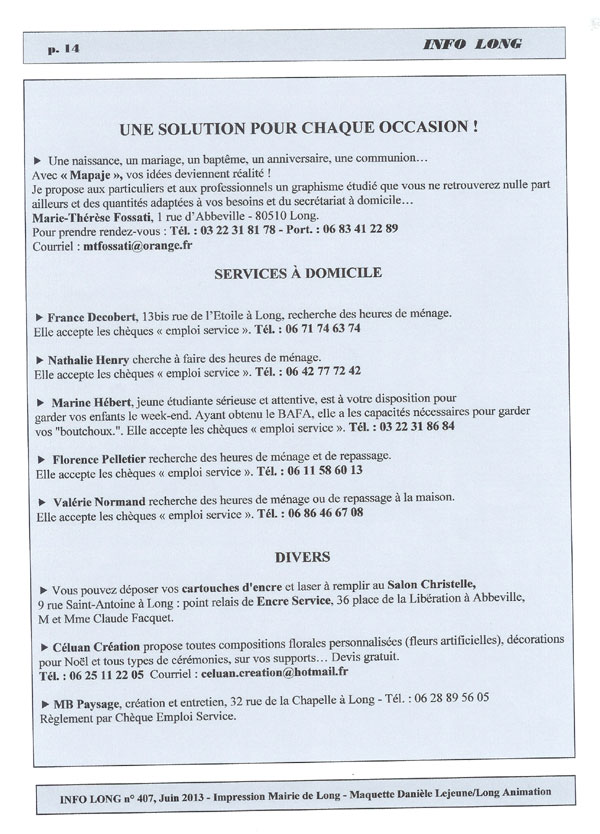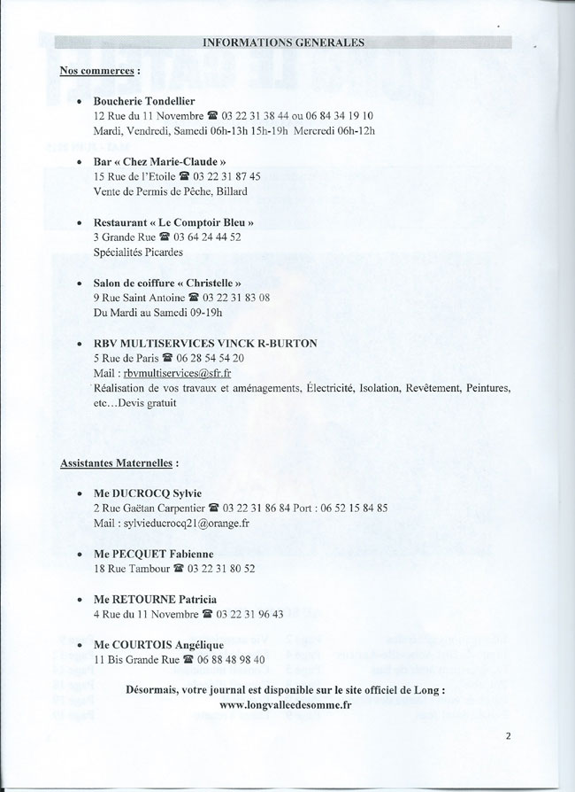 * Mme Colette Kerbouet, 9 rue de Long, Tél. : 03 22 29 24 94