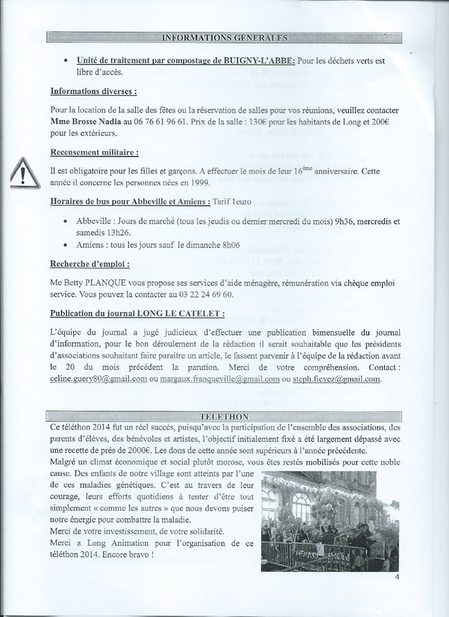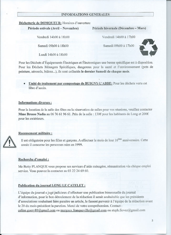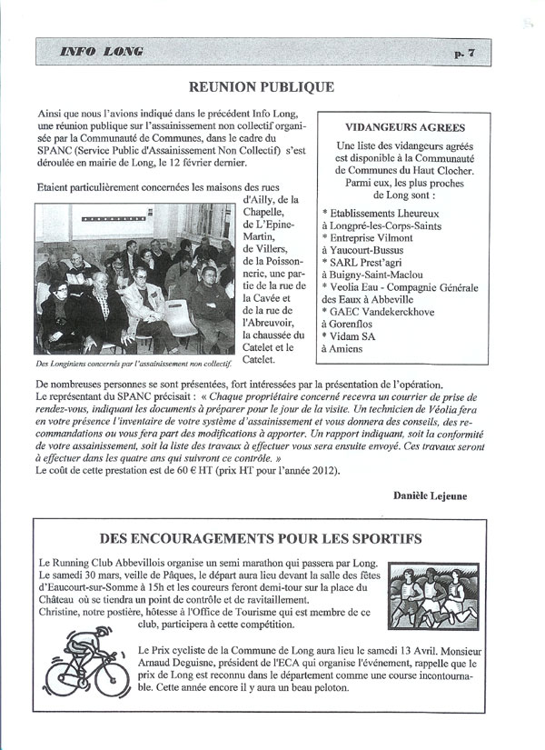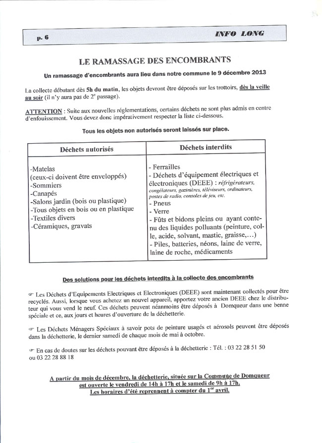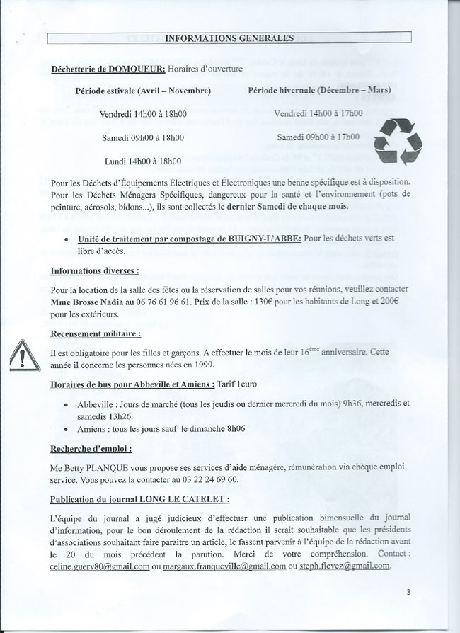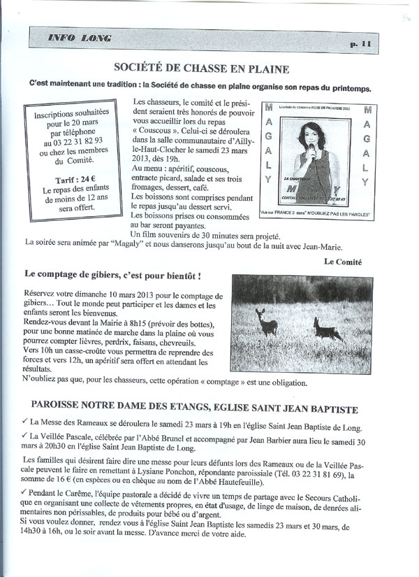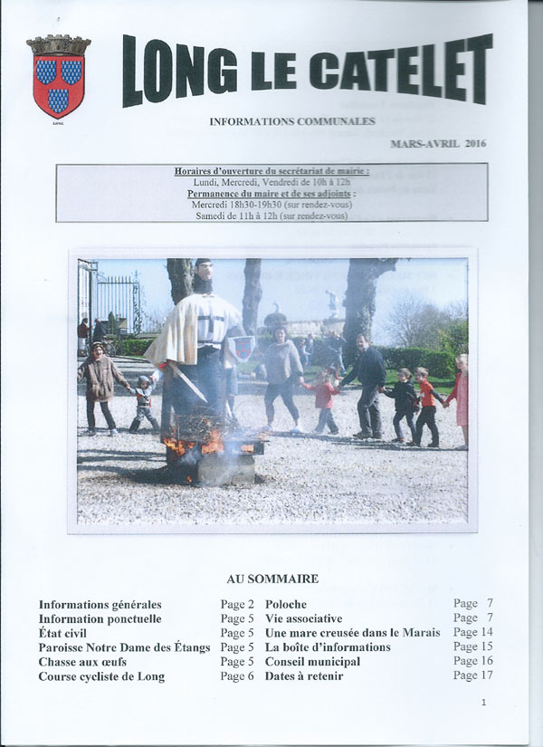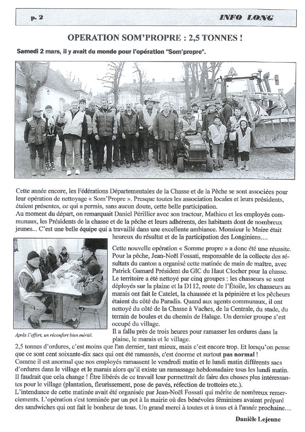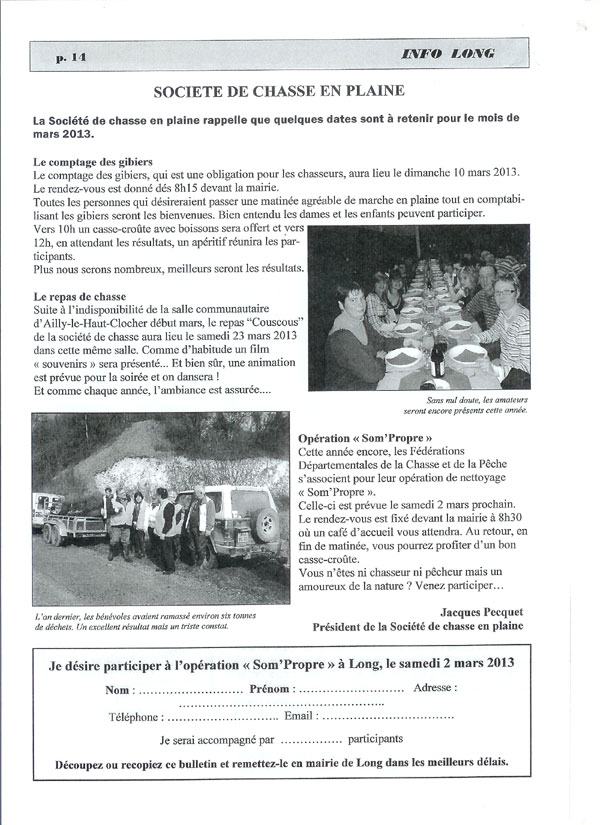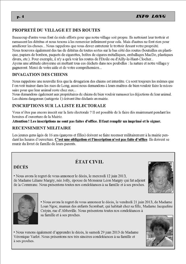 Nous rappelons une nouvelle fois que la divagation des chiens est interdite. Ce sont toujours les mêmes que l’on voit dans les rues de Long, aussi nous demandons à leurs maîtres de bien vouloir faire le nécessaire pour que leur animal reste chez eux... C’est un geste civique. Nous demandons également aux propriétaires de chiens de bien vouloir ramasser les déjections de leur animal (autour de l’église, dans le cimetière, rue Basse d’Abbeville, etc…)