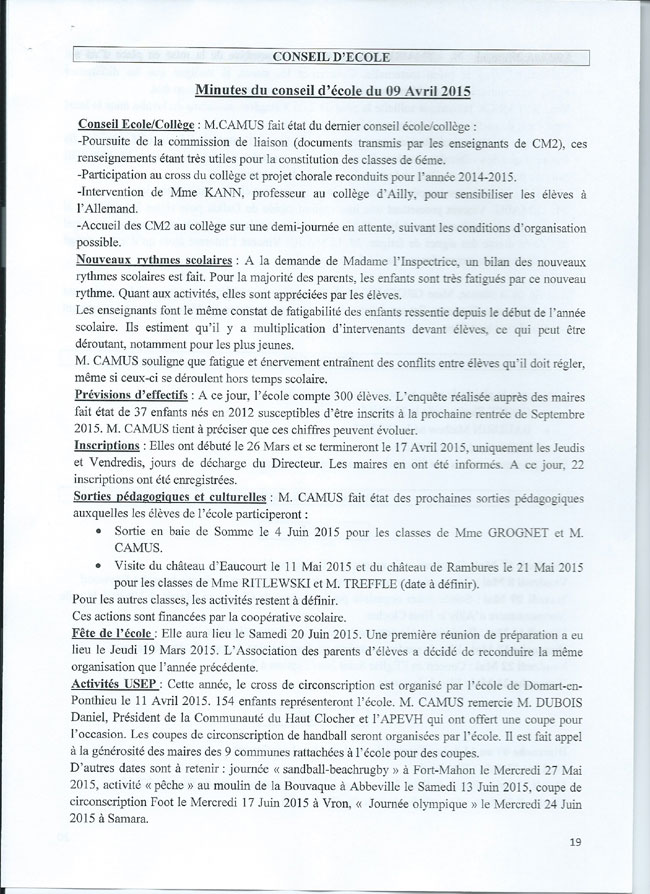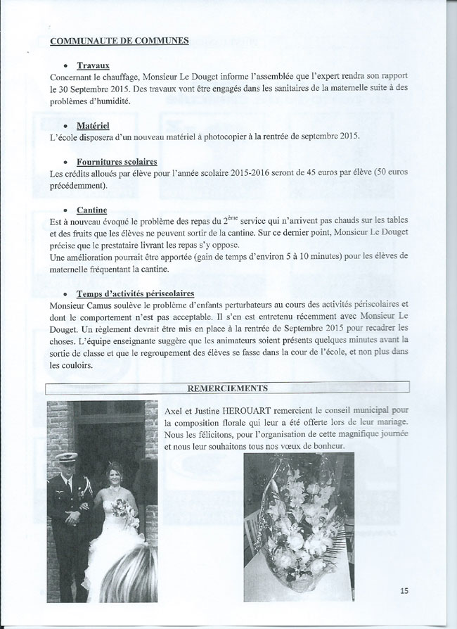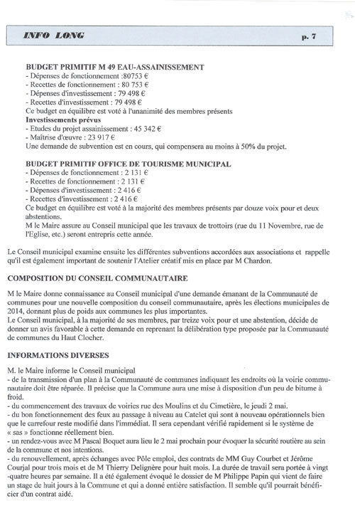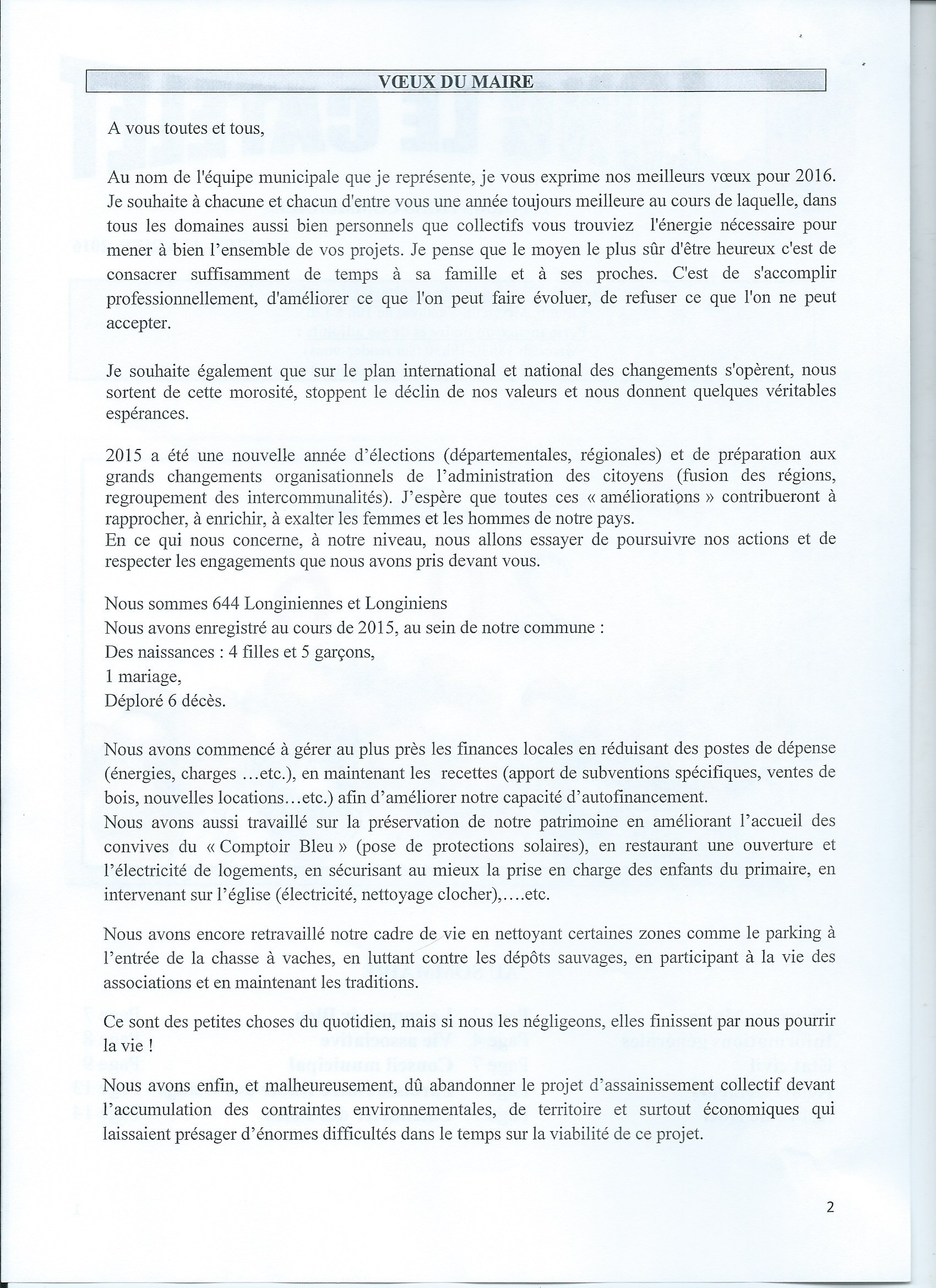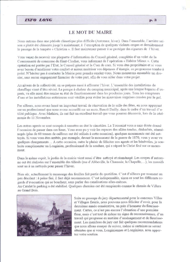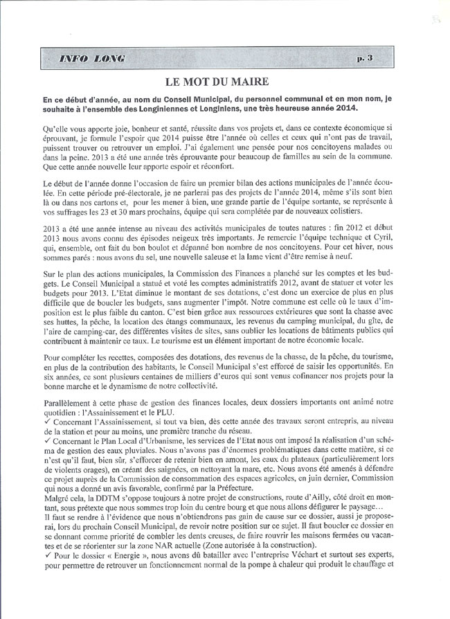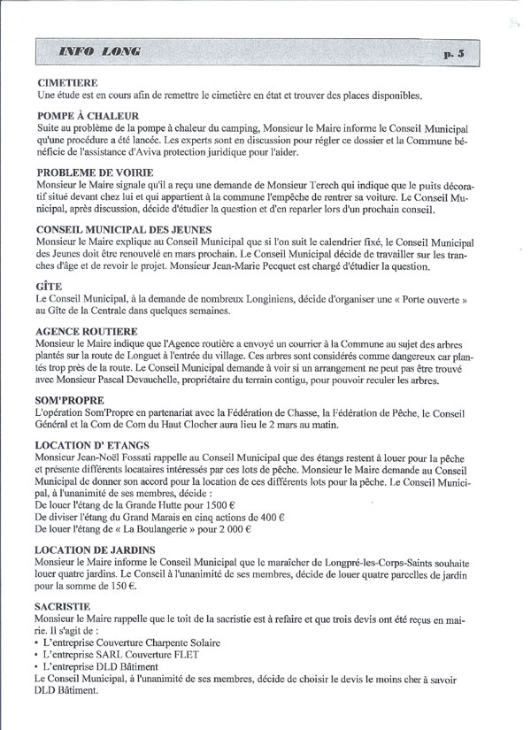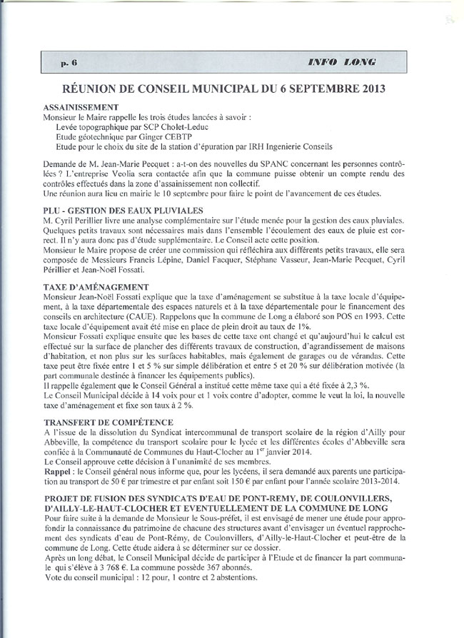 Côté intégration de l’école dans le projet de la Communauté de communes, le dossier est prêt. Il a été présenté en avant première aux Longiniens, lors de la réunion de 16 juin dernier. Il y a eu une bonne participation à cette réunion, puisque plus de la moitié des parents était présents. Dommage qu’ils n’étaient pas tous là car les échanges ont été fructueux… Le dossier est maintenant dans les mains de tous les conseillers municipaux et dans celles des membres du bureau du conseil communautaire.