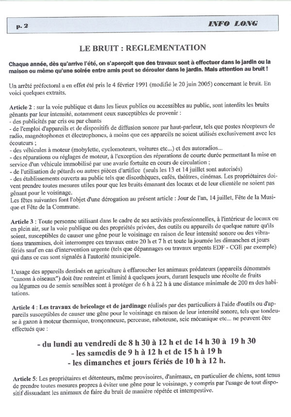 Article 2 : sur la voie publique et dans les lieux publics ou accessibles au public, sont interdits les bruits gênants par leur intensité, notamment ceux susceptibles de provenir: - des publicités par cris ou par chants - de l'emploi d'appareils et de dispositifs de diffusion sonore par haut-parleur, tels que postes récepteurs de radio, magnétophones et électrophones, à moins que ces appareils ne soient utilisés exclusivement avec les écouteurs; - des véhicules à moteur (mobylette, cyclomoteurs, voitures etc...) et des autoradios... - des réparations ou réglages de moteur, à l'exception des réparations de courte durée permettant la mise en service d'un véhicule immobilisé par une avarie fortuite en cours de circulation; - de l'utilisation de pétards ou autres pièces d'artifice (seuls les 13 et 14 juillet sont autorisés) - des établissements ouverts au public tels que discothèques, cafés, théâtres, cinémas. Les propriétaires doivent prendre toutes mesures utiles pour que les bruits émanant des locaux et de leur clientèle ne soient pas gênant pour le voisinage. Les fêtes suivantes font l'objet d'une dérogation au présent article: jour de l'an, 14 juillet, Fête de la musique et Fête de la Commune.
