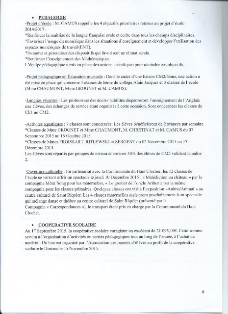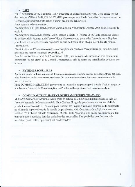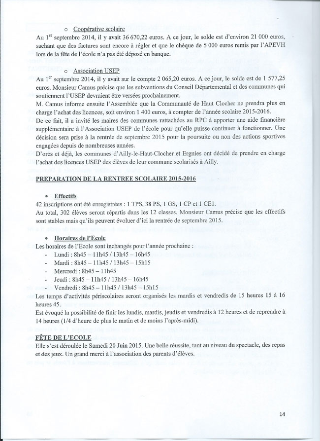Pour rester solidaire des décisions de la com de com du haut Clocher et pour pouvoir garder notre spécificité, il reste donc à trouver une solution pour que l'augmentation du coût de la scolarisation presque acquise (voir plus haut) apporte des plus à nos enfants (éducation avec par exemple des cours d'anglais, d'informatique ou des sorties culturelles ou "nature" etc...). Pour le reste, il faut connaître les souhaits des habitants (cantine, garderie ou service des Aides maternelles ? etc...) et nous devrions obtenir l'aval de la Com de Com. Une Commission (Délégués de parents, Conseillers Municipaux) continue de travailler pour proposer une solution dans le cadre du projet communautaire (RPC ou non).