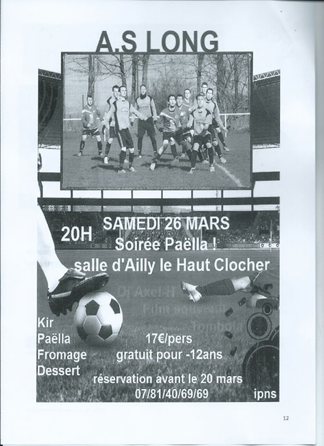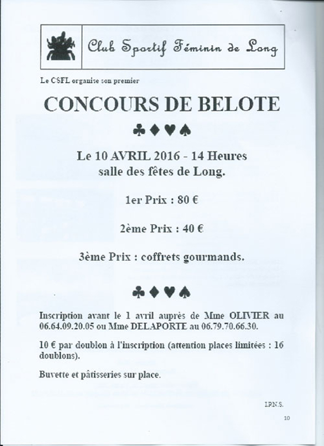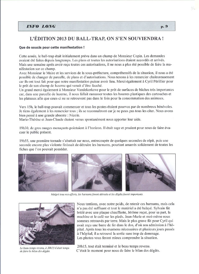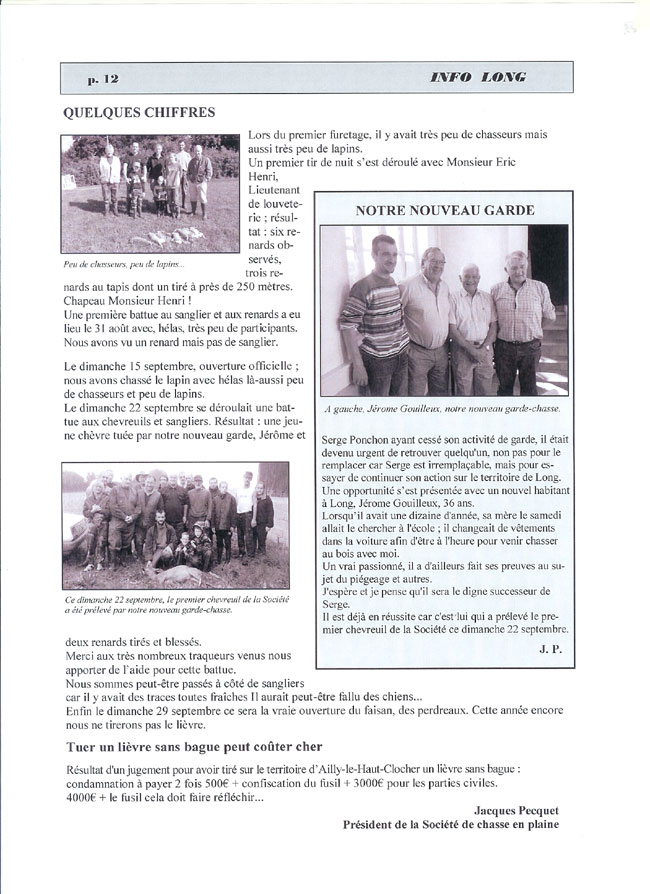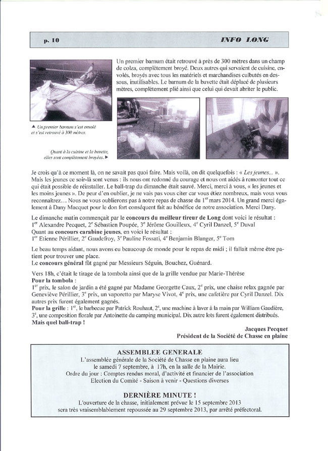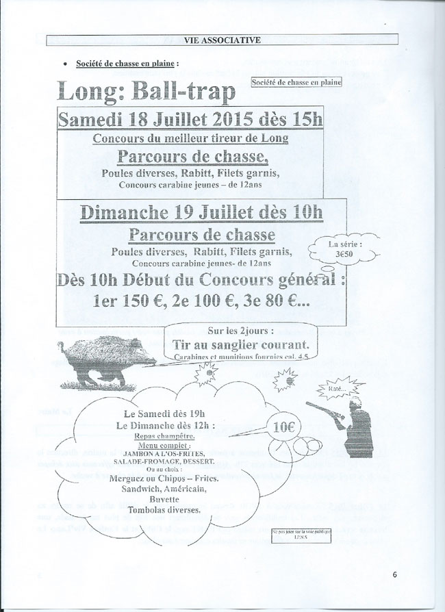 Comme chaque année, la Société de chasse en plaine de Long commence à organiser son week-end ball-trap. Samedi 25 juillet, dès 15h, et dimanche 26 juillet, dès 11h, le ball-trap de la Société de chasse en plaine rassemblera tous les amoureux de cette manifestation. Les concours du samedi et du dimanche seront organisés avec, à la clé, des récompenses non négligeables. Bien entendu le concours du meilleur tireur de Long permettra aux habitants ou à toutes les Sociétés confondues, de se mesurer… amicalement. Des repas champêtres seront proposés sous chapiteaux, le samedi dès 19h et le dimanche dès 12h. Quant à la buvette et la restauration, elles fonctionneront pendant toute la manifestation. Une super tombola est prévue avec des lots qui ne feront pas de déçus : canapé, machine à pain Seb, friteuse électrique Seb, cafetière électrique Moulinex, et bien d’autres lots. Et bien entendu, la super grille avec un lot de choix : un G.P.S. Que vous participiez ou non aux concours, réservez votre week-end : au ball-trap de Long, vous ne retrouverez que ces amis… Jacques Pecquet