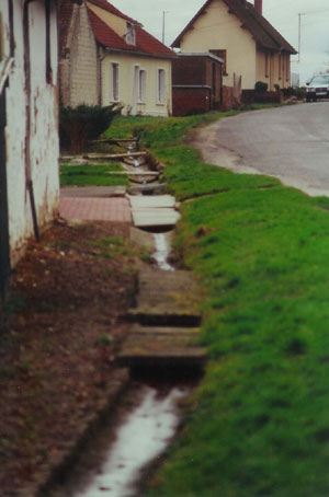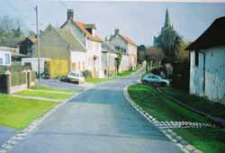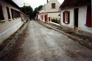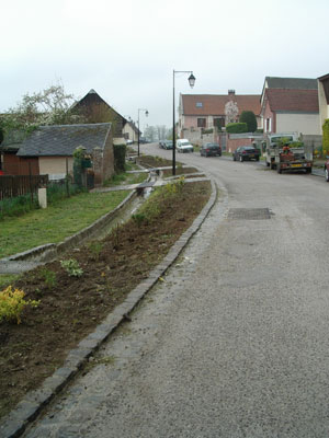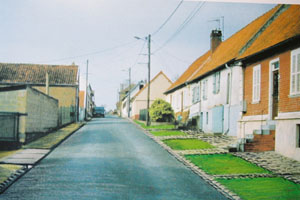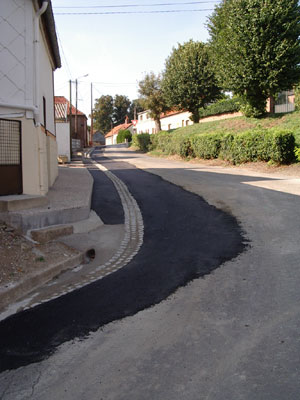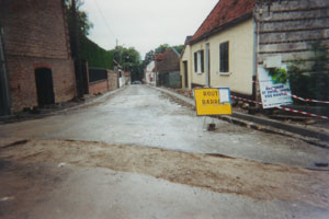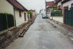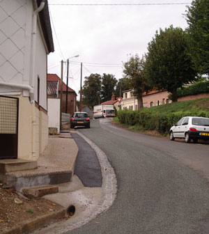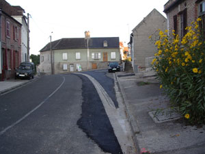 La rue avant travaux et puis la voie bien délimitée avec son ruisseau en pavé et ses abords en herbe